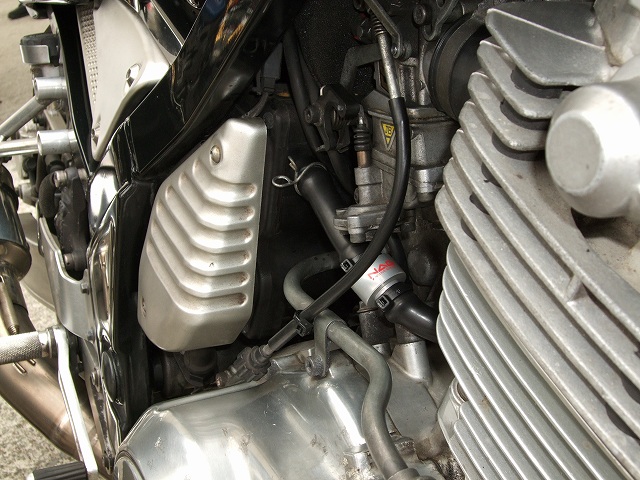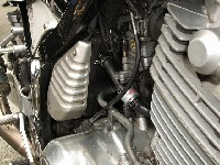 | 同じくKEN3号。今回から、NAG S.E.D.製クランクケース内圧コントロールバルブ投入。 振動とエンブレの低減はしっかり体感できた模様。 二本出しのオリジナルマフラーはワタナベ氏。なんと設計も製作もご自身で行われたそうです! 信号カラーの3人組(笑)ko-ji氏、taka氏、だるちゃん。 |