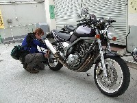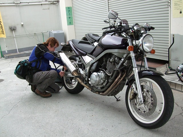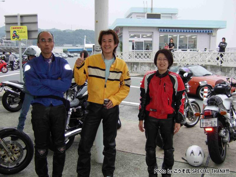 | …で、そんな二人を撮影中のmakoto@管理人(笑) 西湘バイパスでマナー良く千鳥走行中のSRXです。走りながらこんな写真撮ってる僕が一番行儀が悪い。 いつものGSで、激走に備え、タイアの空気圧を調整中(?)のこうぞ氏。 某二輪誌のライターさんです。Blogも宜しく。 |