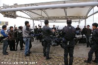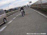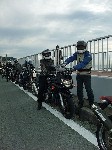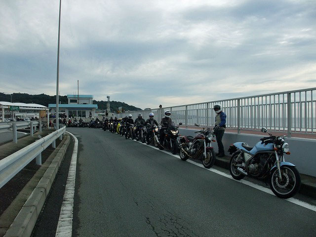 夏休みを挟んで、2ヶ月ぶりの開催ですが、 出発前、makotoさんのそらいろ号にトラブルが発生。 何ぼキックしても、エンジンが始動しません。 そらいろ号とは10年以上の付き合いになるけど、ここまでむずがるのは初めて。 焦る間にも時間はどんどん過ぎて行きます。 結局、何とかかかったものの、出発は20分も遅れてしまいました。 「いかん。このままじゃ幹事が大遅刻だ…」 首都高から第三京浜、西湘バイパスと経由するいつものルートを諦め、 東名高速で一気に厚木まで行って、そこから西湘バイパスへ向かいます。 ぎりぎりで間に合って、ほっと一息。 「…なンかエンジンかからなくてぇ」 「エキパイが太くなって、セッティングがずれたんですかねぇ?」 「うーん。意外とそうかも」