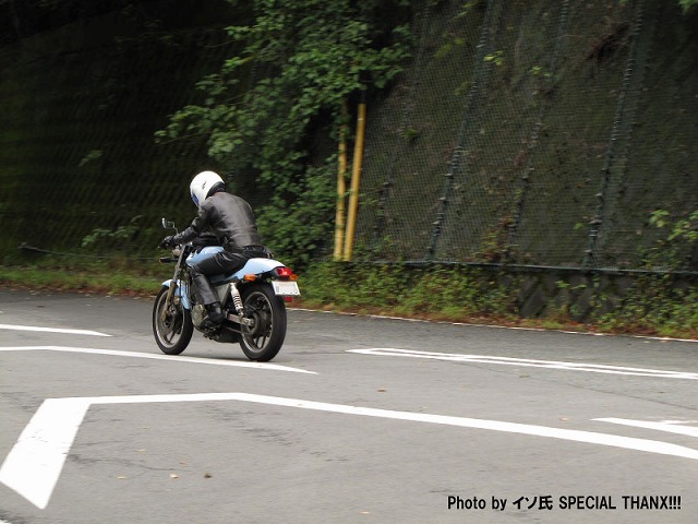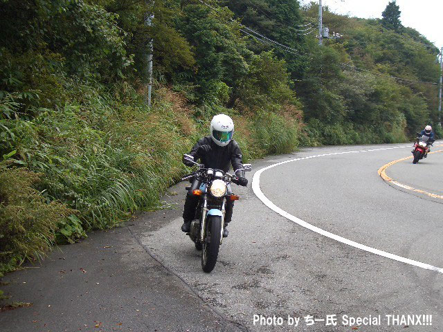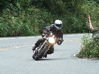 例に拠って、皆の姿をファインダーに納めるべく、“5分前に椿ラインを先行する”makoto@管理人。 その姿が、イソ氏、gizmo氏、ちー氏にフォーカスされていました。 バンク角からして、後に登場する猛者たちと比べると非常ににヌルいペースであることがわかります。 |