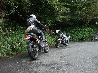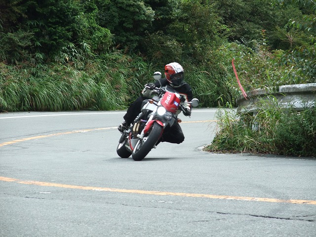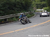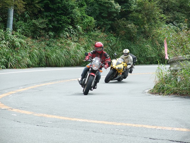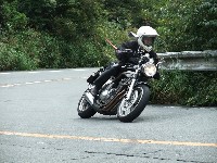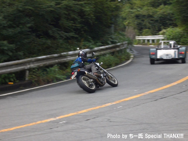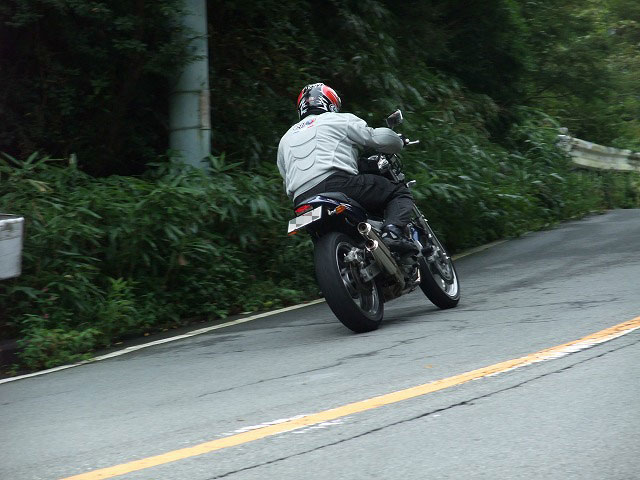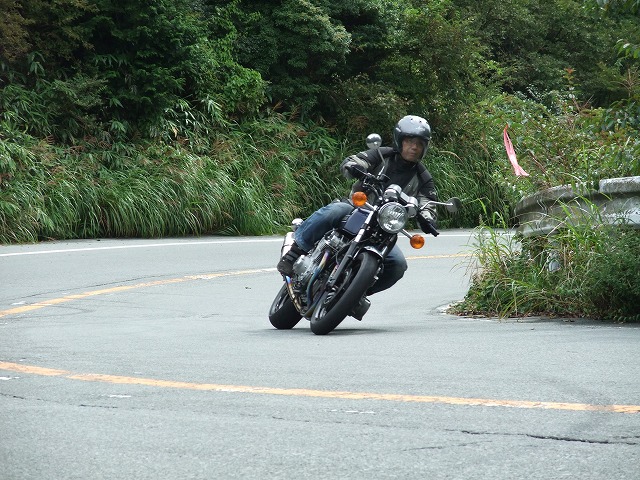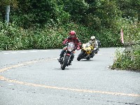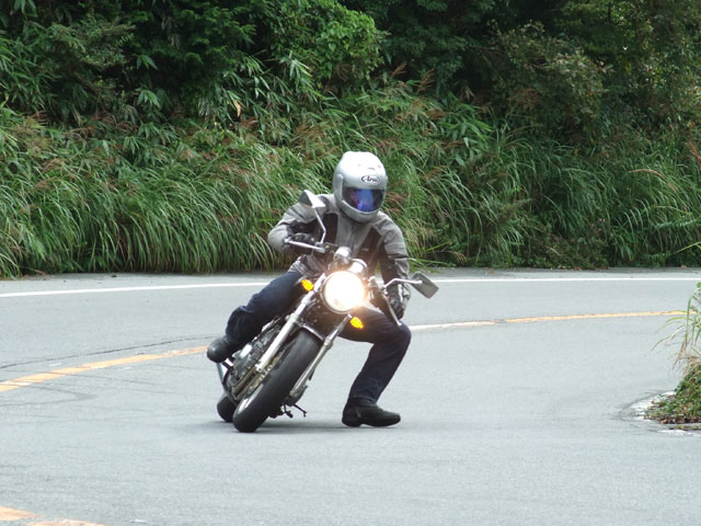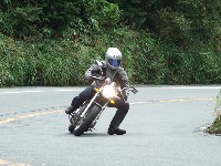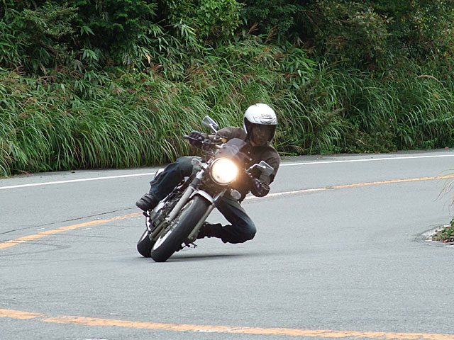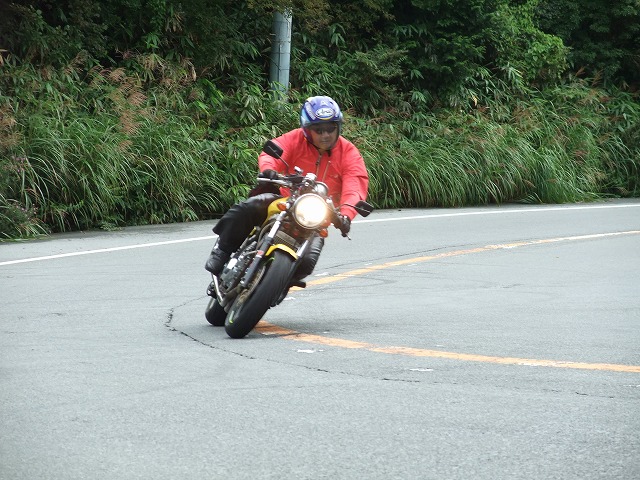 | おっとっと…。キャブが不調で軽くオーバーランのつねお氏。 まめしば氏二本目!写真ではそうでもなさそうに見えますが、結構なハイペースです。 鬼バンクでスーパーセブンを追うこうぞ氏。えーと、ストレス溜まってる?w 公道ですよん。もちょっと控えましょうねw |