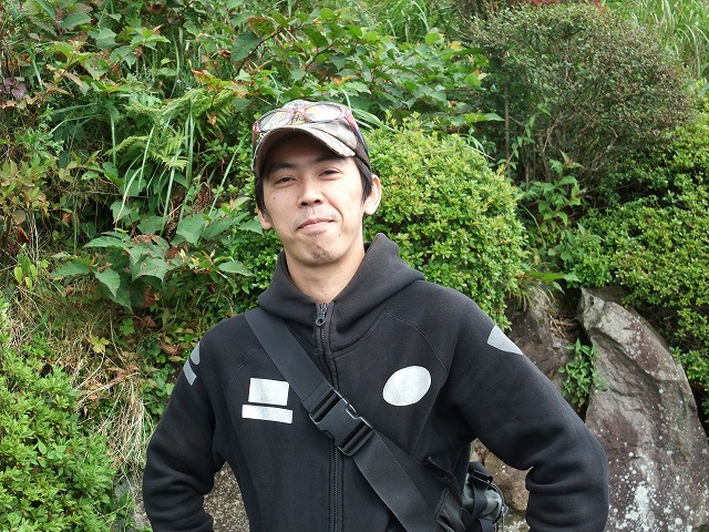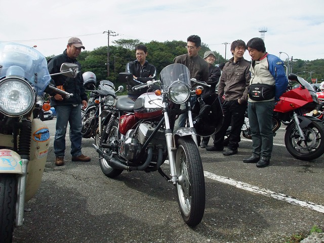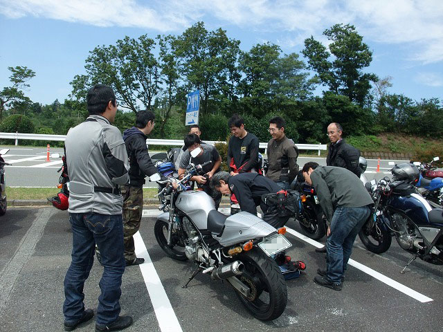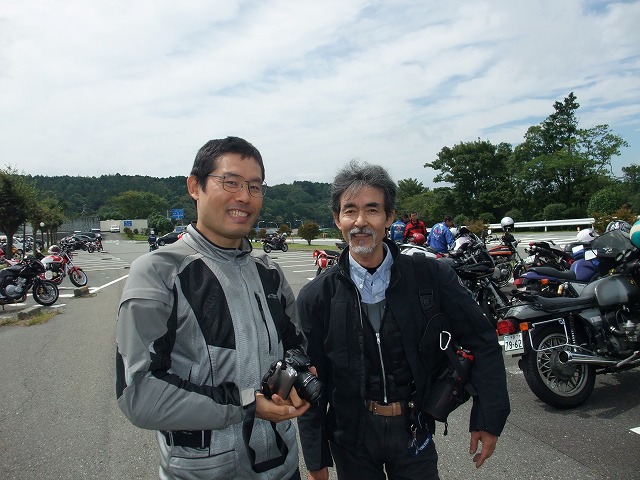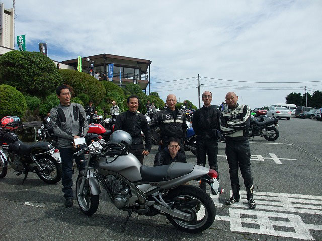 | 左から、イソ氏、Takashi氏、ヨネヤ氏(上)、中ー馬ッ鹿氏(下)、ko-ji氏、ベン太郎氏。 カメラ部イソ氏の視点から。手前の一列はすべてman3組。 (変なプレッシャーがかかるので)あんま意識しないようにしているんだけど、かなりの大集団です。 ここで、中部組と共にキャブ仙人こと永冶 司氏が合流!イソ氏とのツーショットです。 |