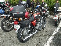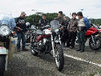 | 仙人殿と挨拶を交わす関東組。しかし、歓談する暇もなく恒例のキャブ診断に駆り出される仙人殿。 まな板の上の鯉はtaka氏のマシンですね。この後、当然のように店開きw 片隅には、Zeppan Bikesつちやま氏のエルシノアが寂しそうにぽつん。 このミーティングの後、真面目にSRXが欲しくなったらしいですよw |