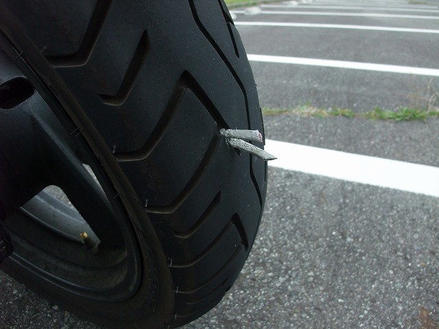 | ヒロセさんのタイアが釘を踏んでる?はいはい出番ですね。 ツーリング時は必ずパンク修理キットを持参しているmakoto@管理人です。えへん。 でも何故か、自分のバイクのパンク修理はしたことがありませんw |