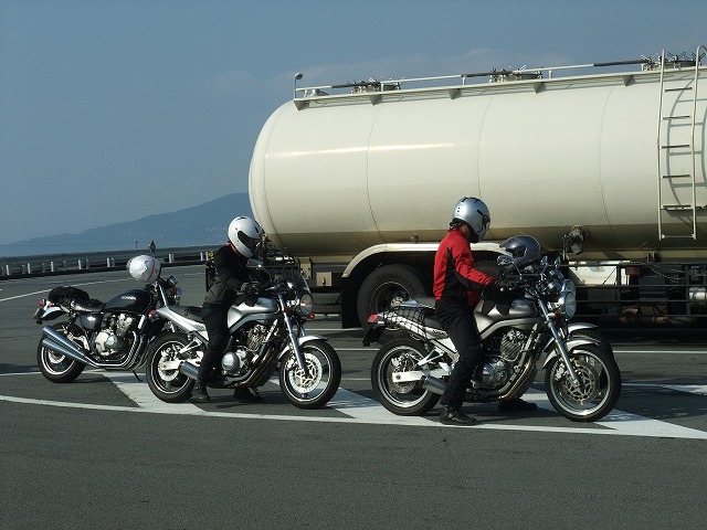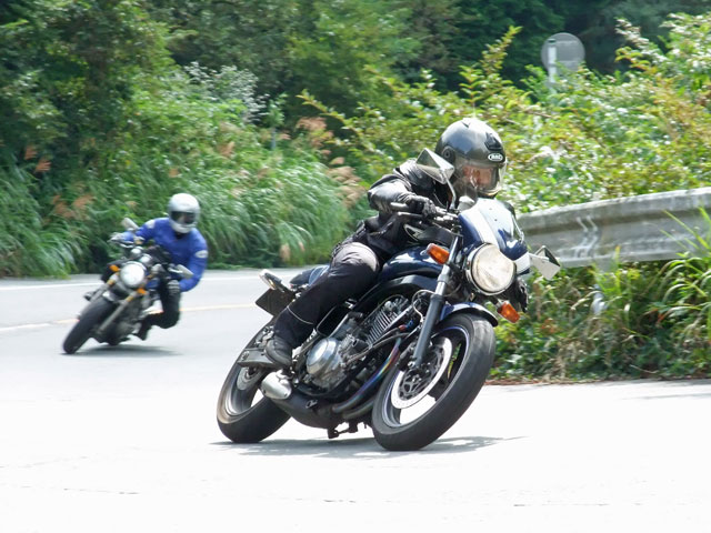 先頭のR100RSはてっちゃん氏、続いて、CBR900RRの九氏。ブルーのTRXはsugar氏。