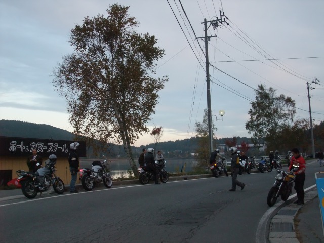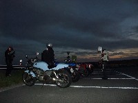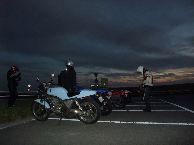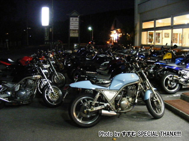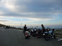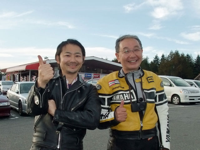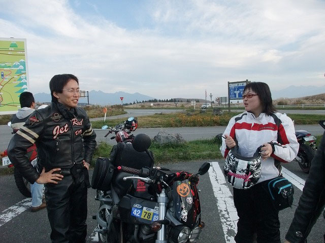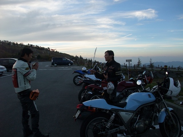 | SAT氏と一条さんとのツーショット。おふたりとも、いい笑顔です♪ 湯煙亭婦人、Yui姐さんは箱付きセローで参加。全国オフはすんげー久しぶりじゃないっすか? よーやく合流できた寝坊夫妻は、絶賛罪を擦り合い中www みんなそろそろ宿に戻るとゆってますが、関東下道組はビーナスを堪能しに反対方向へw 荷物はあっこちゃんが見ていてくれるそうで、やっと身軽な装備で走れる。 |
