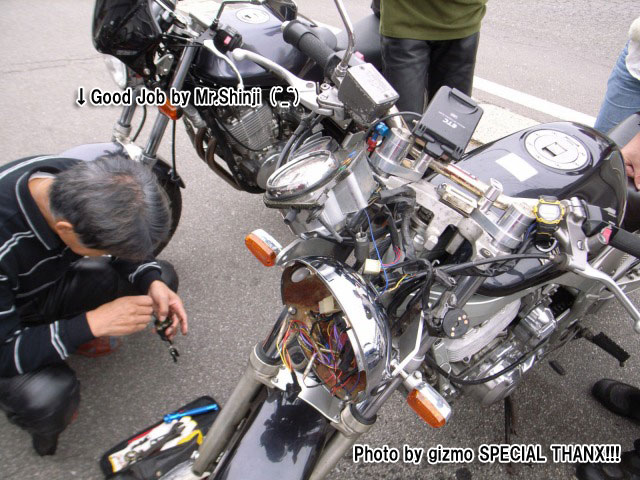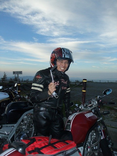 | すすむ@寝坊氏、走行中に落としたキックアームを手に爽やかスマイルw 同様のトラブルは2回目だそうで、シート下にスペアナットを隠し持っていました。 いきなりバックミラーから姿が見えなくなったから、心配してUターンしちゃったよwww |
