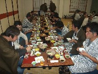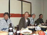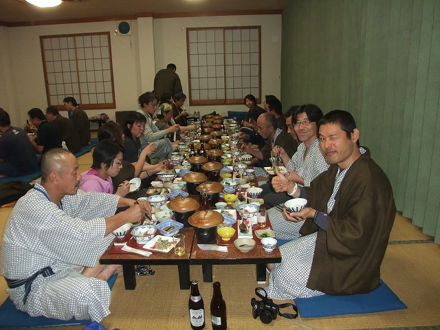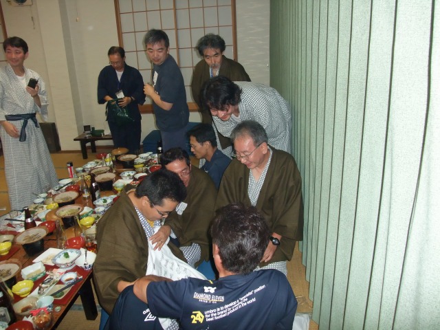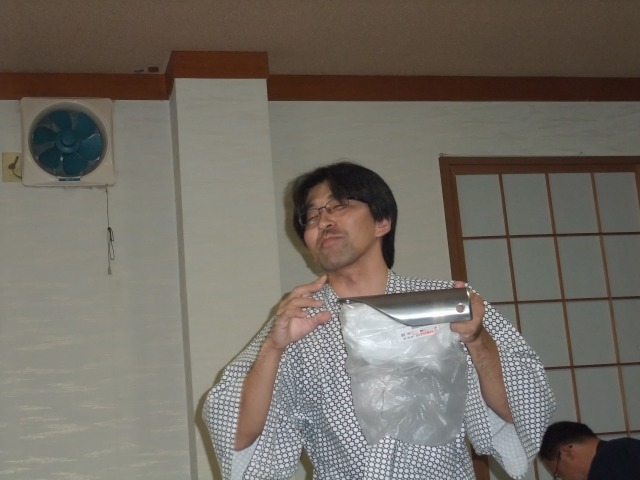 | そそくさと入浴を済ませ、浴衣に着替えて、既に始まっている宴の席に滑り込むw タヌぴっつあんにビール注いで貰ったよ。神に愛された漢の勺です。ありがたや。 恒例のビンゴ大会用景品は、すべて参加者の持ち寄り。 |