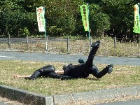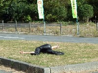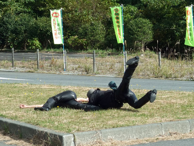 | 亀石PAでは、バイク餅氏がお待ちかねでした。 トップ頁のスケジュールに合わせて来たら、まだ誰も来てなくて困ったそうです。ごめんなさい。 台数が増えるに従い、ビミョーに時間は遅れがちになっています。 まだ10台前後しかいなかった頃から変わってないからなあw 芝生に寝転んで、腰痛体操中(?)の猫氏のお尻。 そのお尻めがけて、33氏がピンポンダッシュ・ダイビング・カンチョーをお見舞いするの図w |