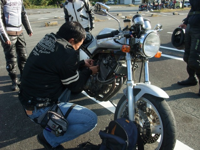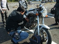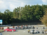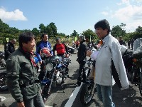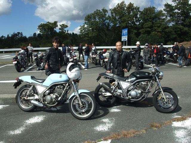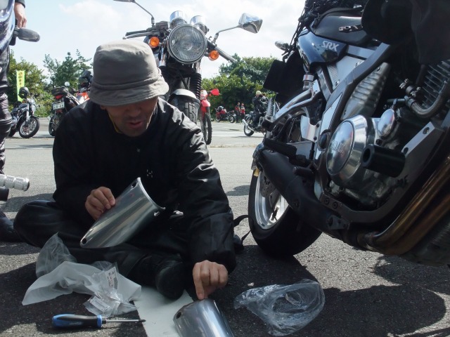 | makoto@管理人は、初参加naga氏と初期型を二台並べてツーショット。 ちーさんがシャッターを押してくださいました。この写真、実はとてもお気に入りです。 先月の全国オフのじゃんけん大会にてゲトしたマフラーカバーを、 見せ付けるようにこの場で交換する33氏。いいなぁw さて、お昼ご飯は久しぶりに“峠の茶屋”へ行きましょうか。 | ||