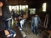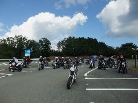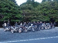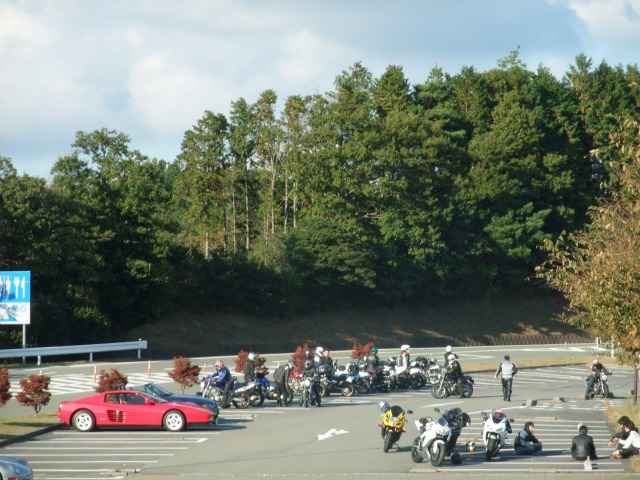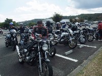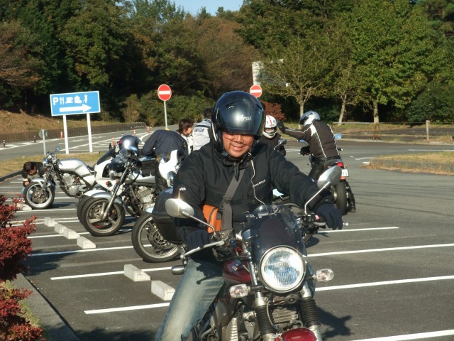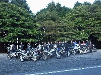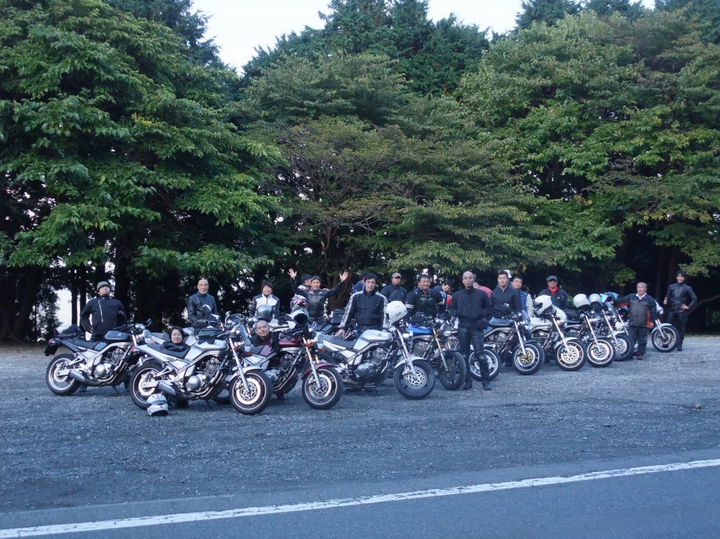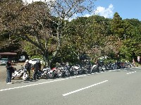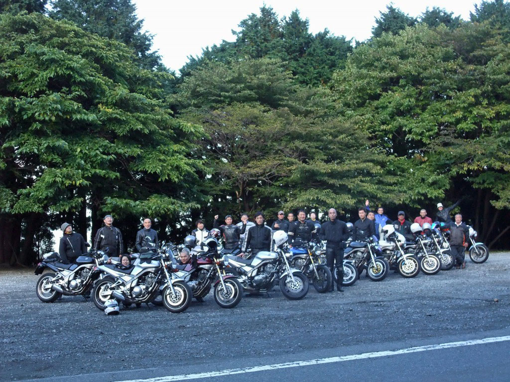 | 食後は冷川出口方面へ、通称「ジャリ」の駐車場までもうひとっ走り。 今年最後だから、集合写真を撮影してみました。(先に帰っちゃった人すみません) 画像にずいぶん青みがかかっていますが…。 カメラの設定が、走行写真を撮ったときのままで、スポーツ・モードだったせいかしら? |