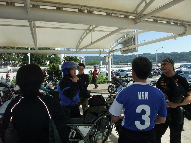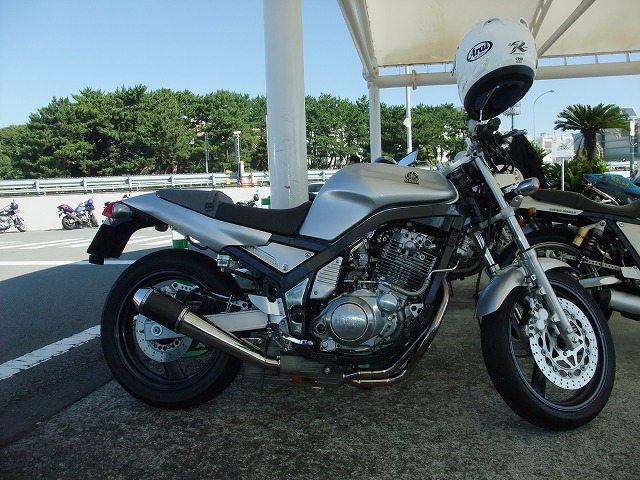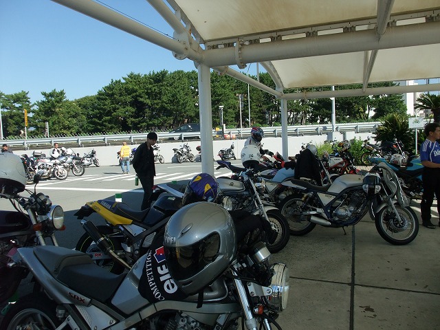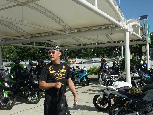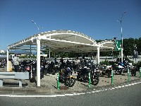 朝7:30の西湘PA。既に強い日差しが注いで、バイクもヒトも木陰に避難しておりますw |