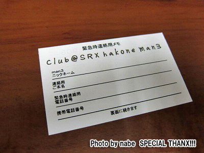 ども。makoto@管理人です。 6月は所用でDNS(Do Not Start)だったので、二ヶ月のご無沙汰でした。 …で、僕がいなかったman3で、 代理幹事のちーさんから参加者の皆さんに配られたのが、この『緊急時連絡用メモ』。 万が一、事故が発生してしまったときに、 誰も当人の本名も連絡先もわからないようでは困るということで、 nabe氏に依頼して造ってもらったそうですw