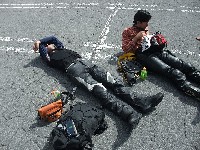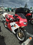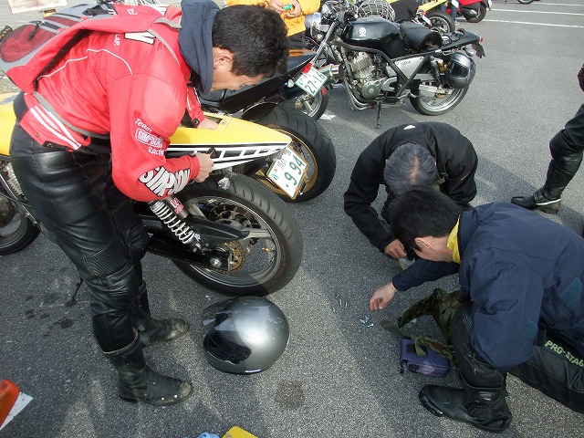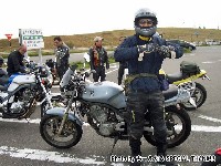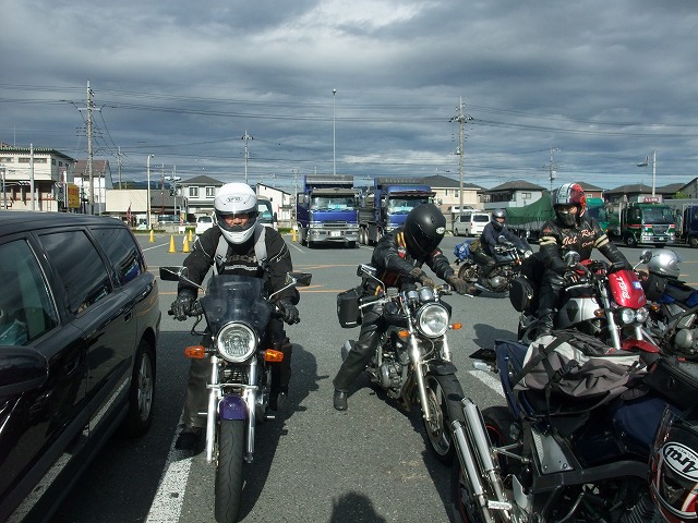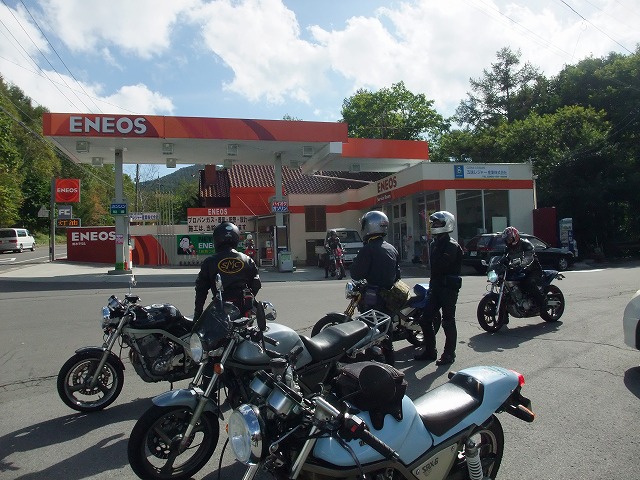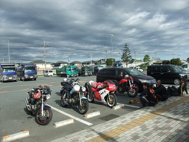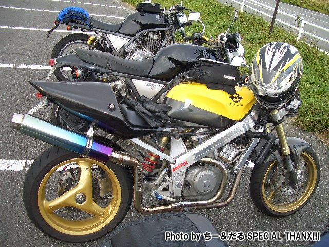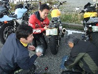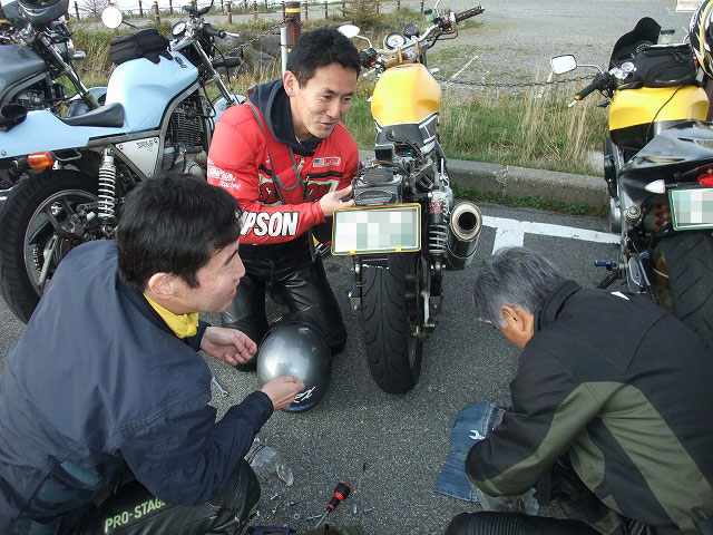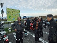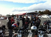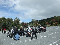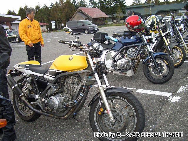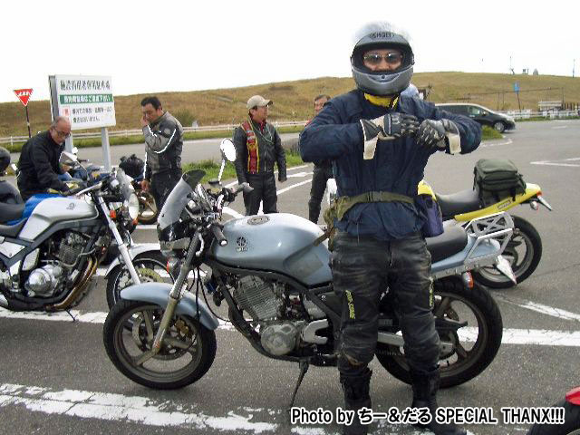 '80〜'90年代の頃のヤマハ車は、レギュレーターがパンクしやすいことで有名ですが、 富山から(!)日帰り参加のまる氏は、美ヶ原から松本方面へ抜けて帰還されるそうです。 前日の夜に香川を出発し、瀬戸内海を渡って不眠でここまで来られたうしパパ氏。 |