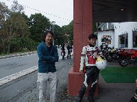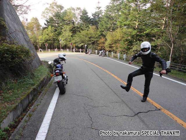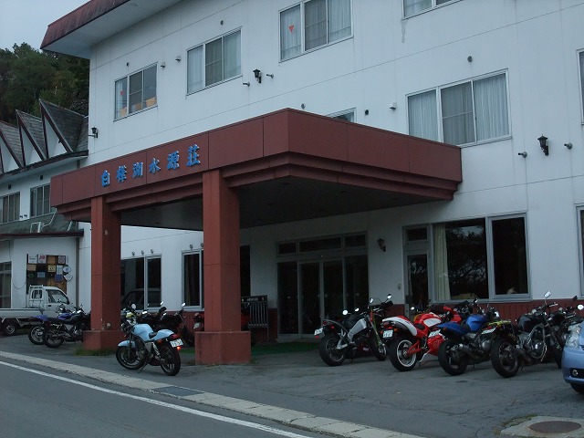 もう少し観ていたいけれど、そろそろ宿に戻りましょうかね。 Buellのミーティングと間違って紛れこんじゃったひとが、 朝ごはん食べて一階に降りると、水源荘前で試乗会が始まってましたよ。 |
