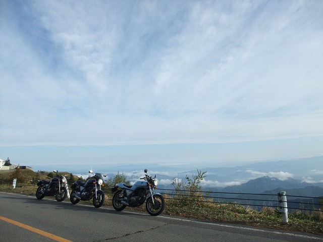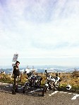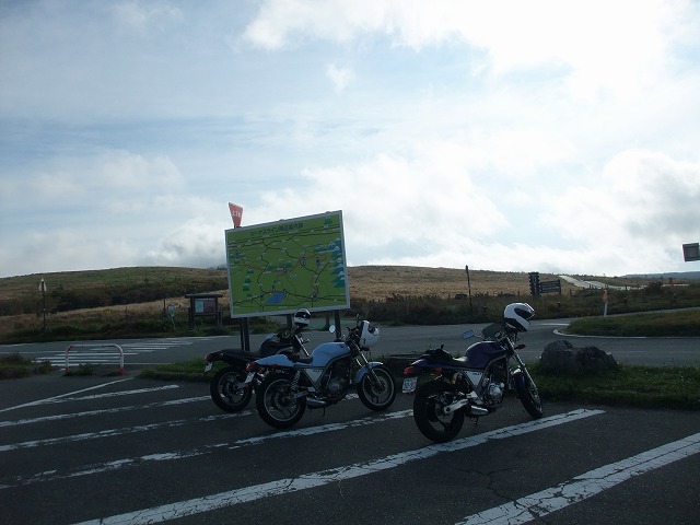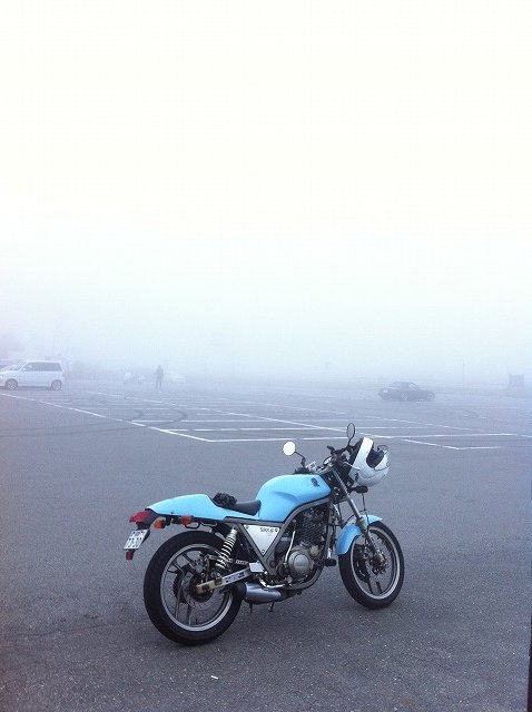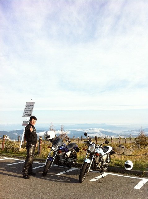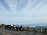 一夜明けて、恒例の朝練…、と思ったら、みんな起きてきません。 深い霧に包まれた霧が峰。nakamura氏の姿は…ない。 丁度、美ヶ原から折り返そうとするnakamura氏と合流できて、3台で記念撮影。 |