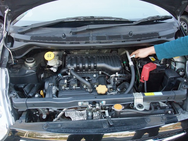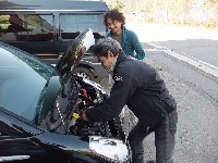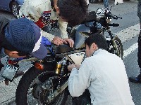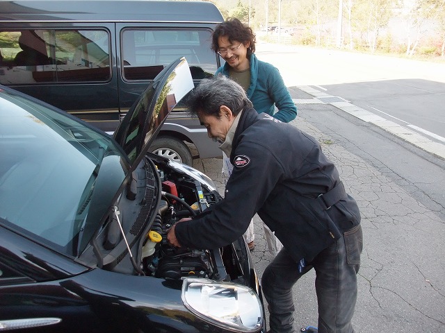 SAT氏は愛車のスバルR2にNAGバルブを装着するため、キャブ仙人こと永冶氏と相談中。 |