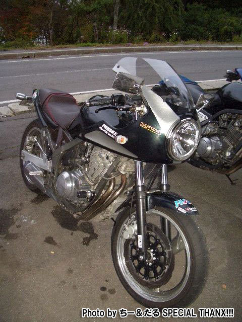 さて、水源荘に戻ると、これまたどた参のSAT氏の姿が。 DB2のサイドスタンドはオートになっていて、バイクを起こすと勝手に跳ね上がります。 スズキBandit400LimitedのハーフカウルがちょーカッコイイIV型のオーナーはトール氏。 |