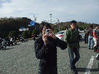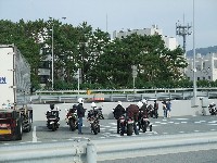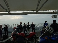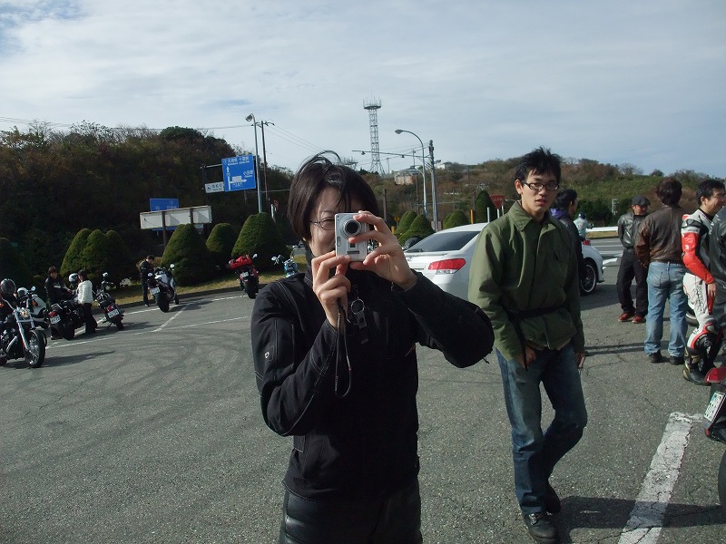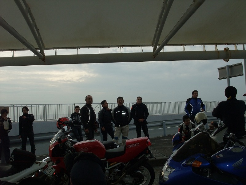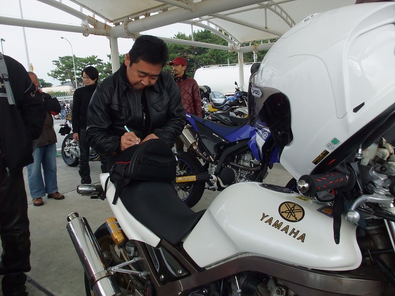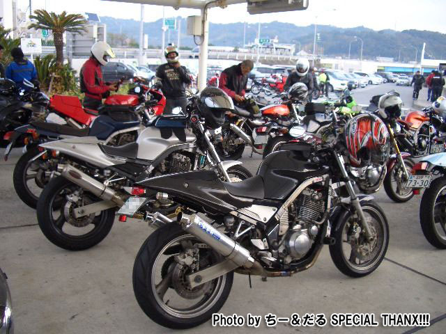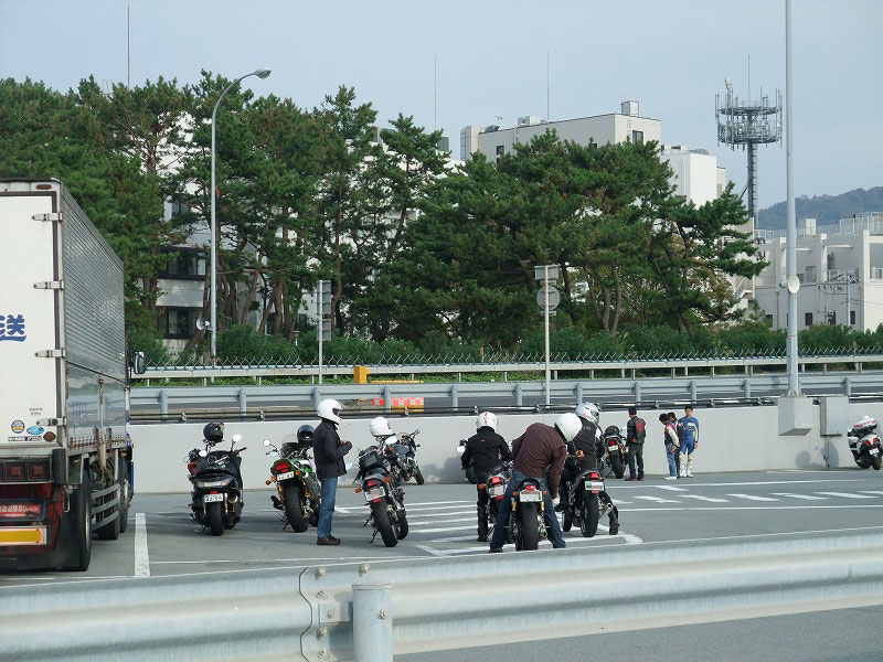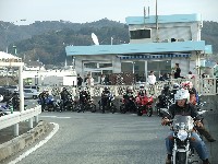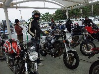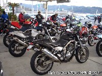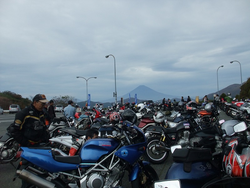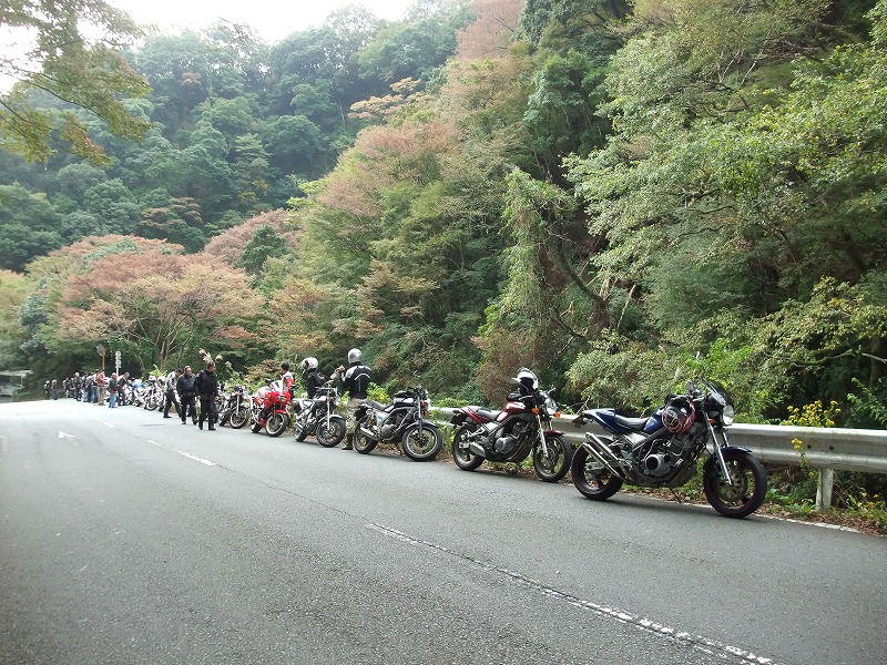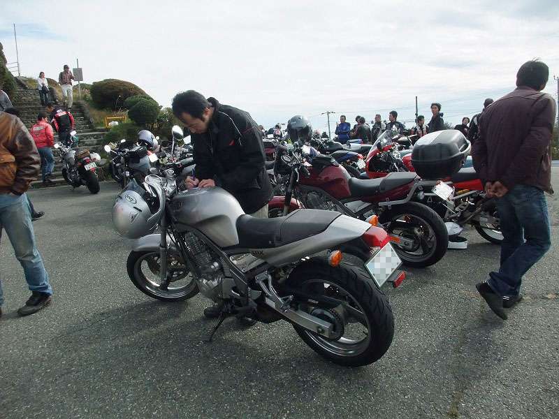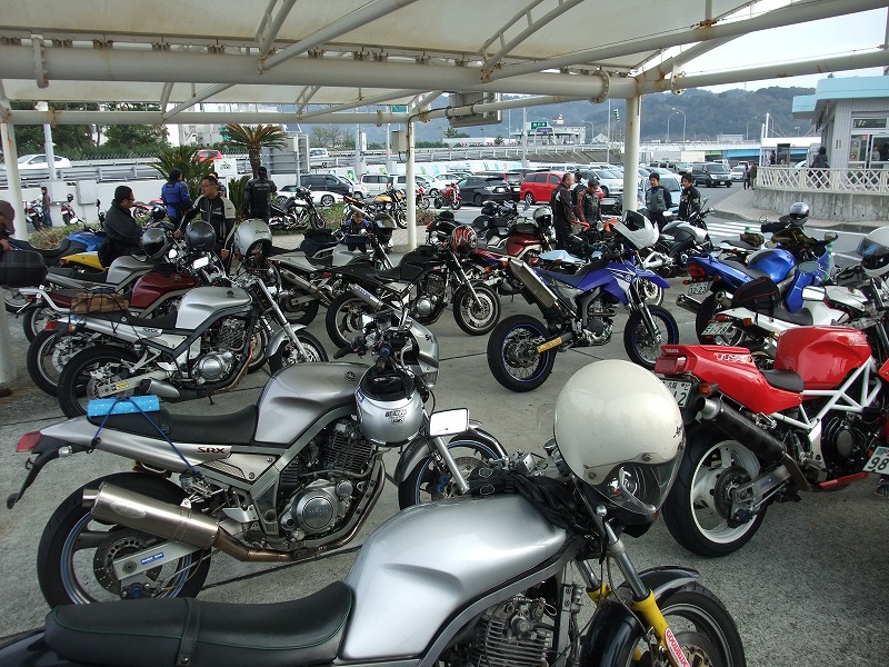 椿ラインの麓にずらりと並んだ参加者たちのマシン。