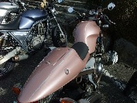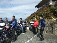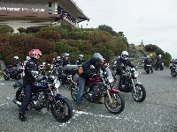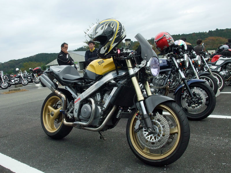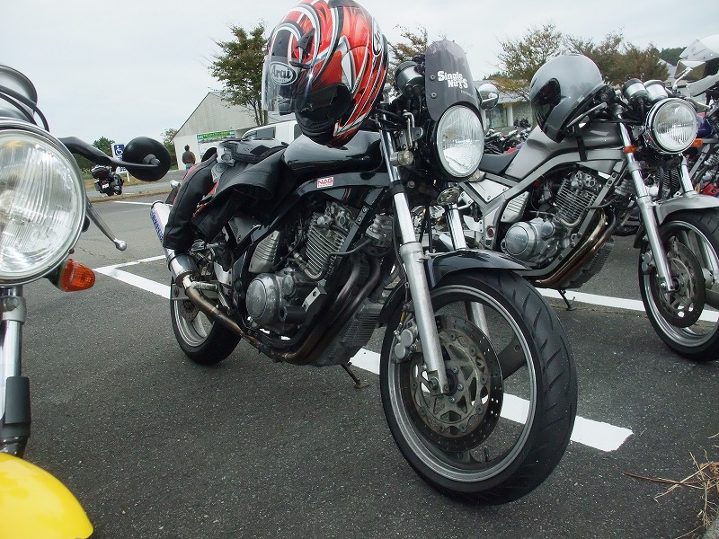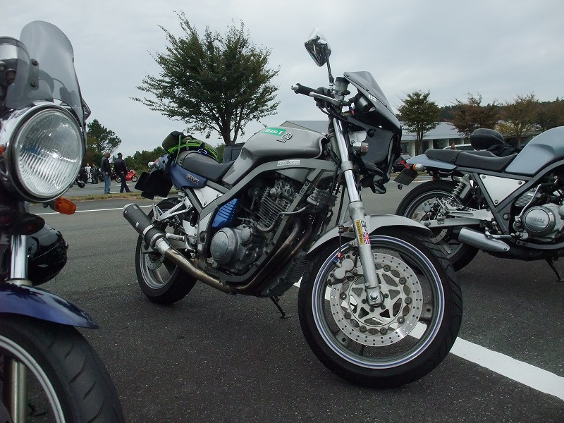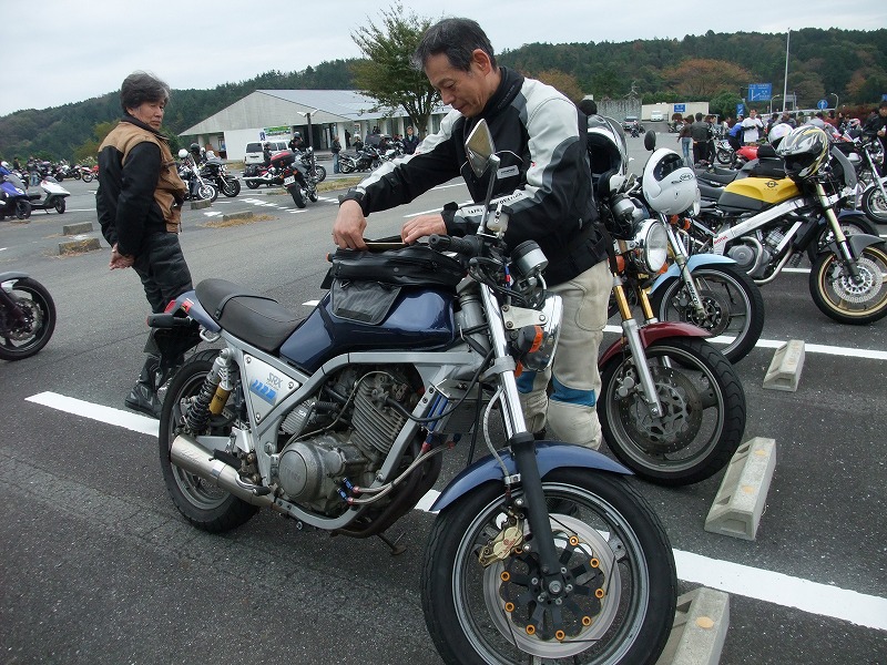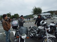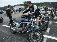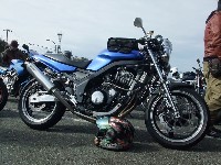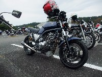 じん@毎日とうさん号。青いシートカウルと銀のタンク、黒いミニカウルが特徴。 OWL氏号。OverのスリップオンにFCR、キャリパーはBremboと、ツボを抑えたカスタム。 初参加のNorio氏、じん@毎日とうさん、そして、やはり初参加のmulsanne氏。 |