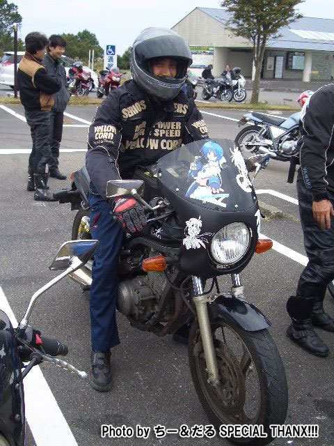 SRXには珍しい、えーと、ぷち痛系バイクなのですが、メットに「こっち見んな!」とか書かれてて、