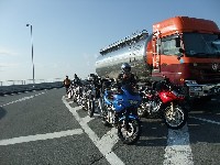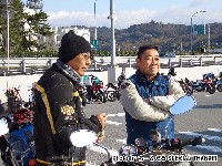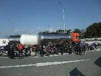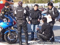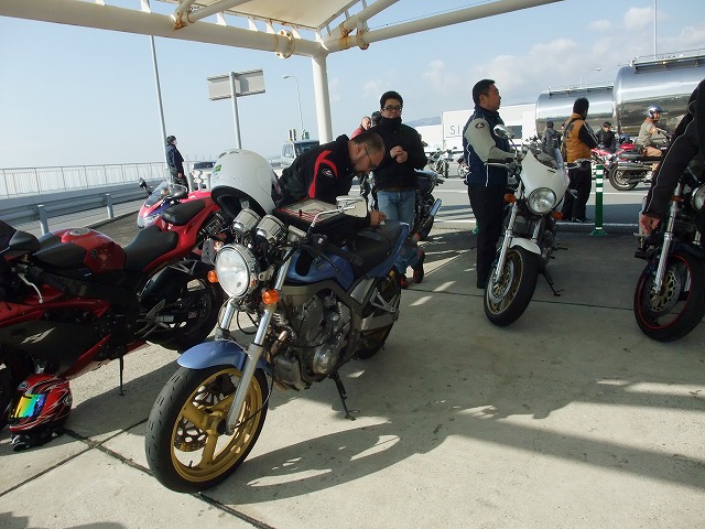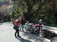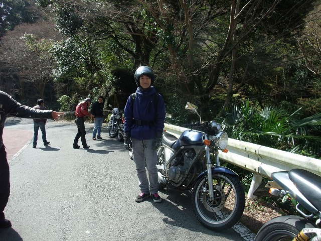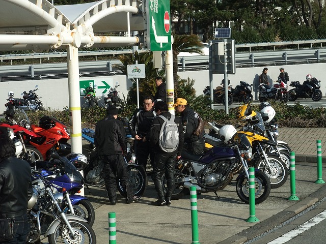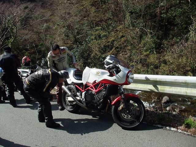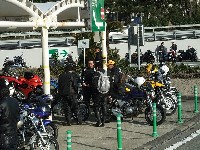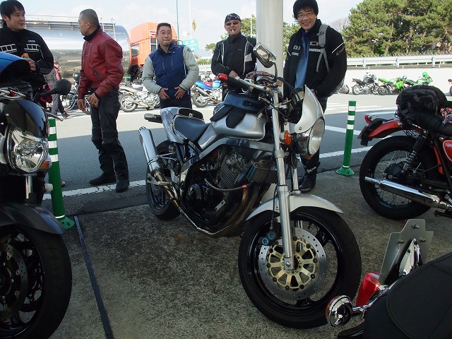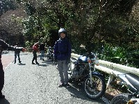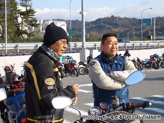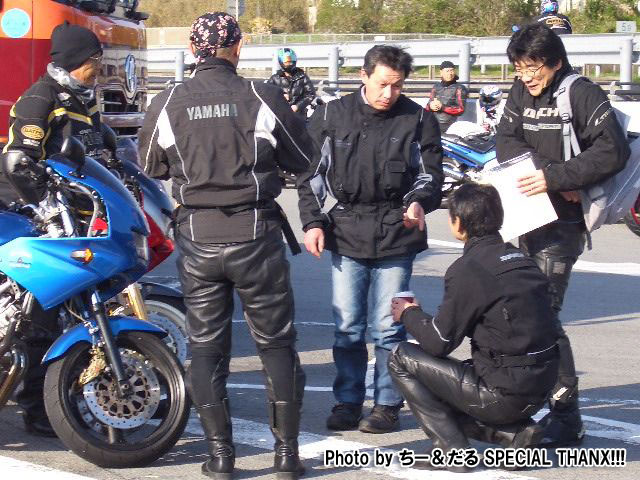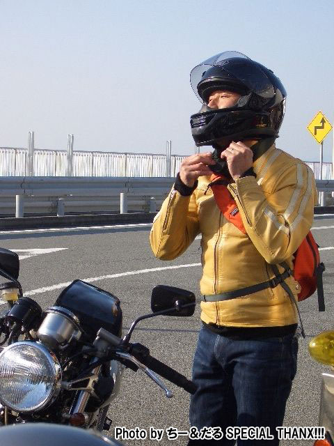 休暇申請の理由がツーリングであることを見透かした上司にいぢわるされて、 黄色い革ジャンはベン太郎氏。 sugar氏とたー坊氏。 |