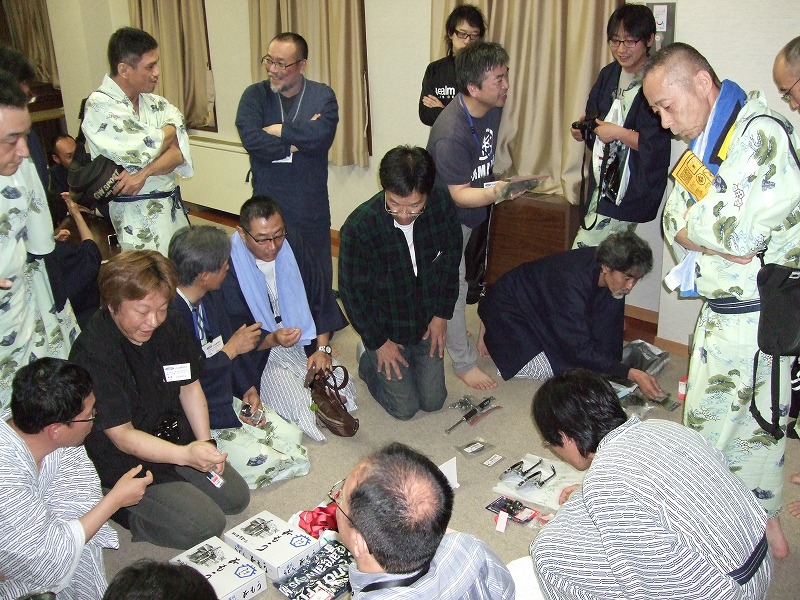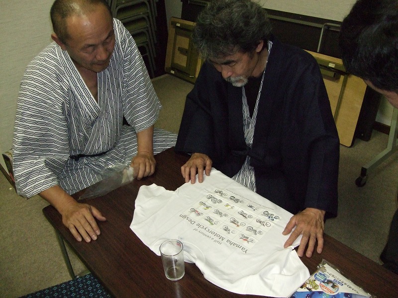 ちーさんと永冶氏が見つめているのは、1J氏が景品に持ってきてくれたヤマハのTシャツ。