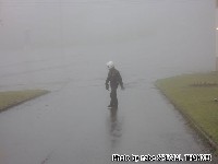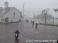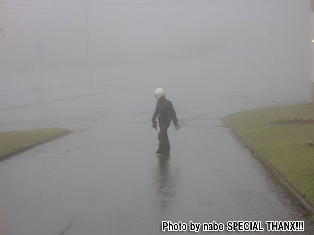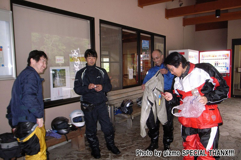 バイクを置いて、雨に濡れたそらいろ号を拭き、カッパ&ヘルメット姿のまま、とぼとぼと戻ってくる僕。 |