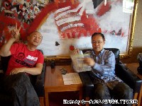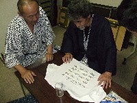 SRXのイラスト入りTシャツに一条氏のサインを戴いてご満悦のすすむ氏。