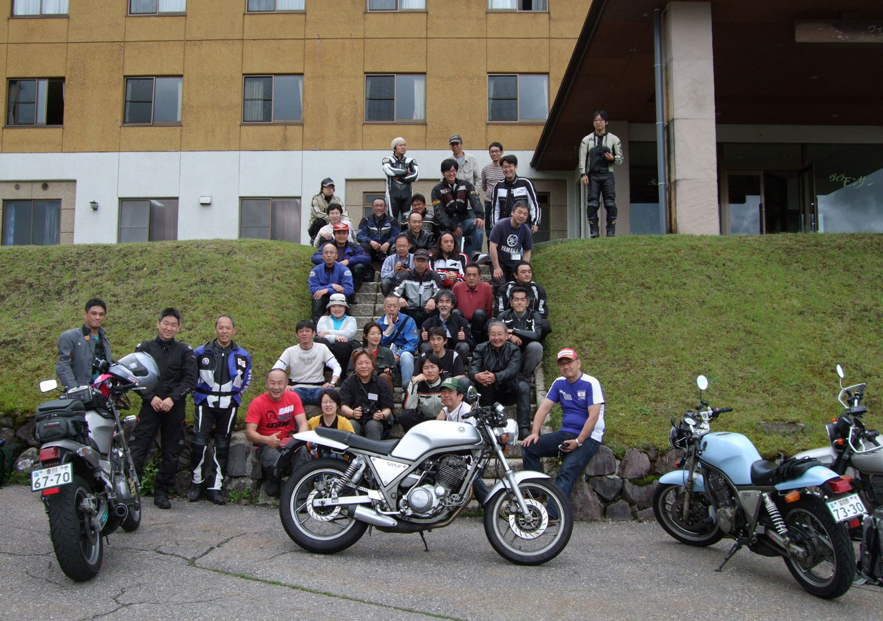 超セパハン&超バックステップのこのマシンで昨日の雨はさぞキツかったことでしょうw こちらも笑いの耐えられn…もとい絶えないおぢさんたち。何がそんなに可笑しかったんでしょうねえ? みっきーさんが出発した直後に集合写真撮るぞの号令がかかりました。 |