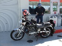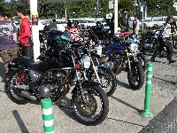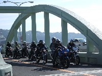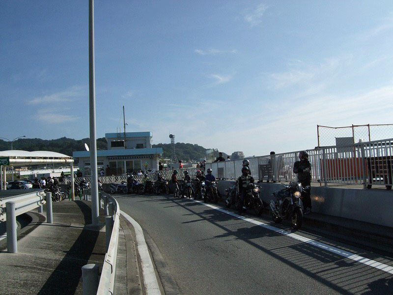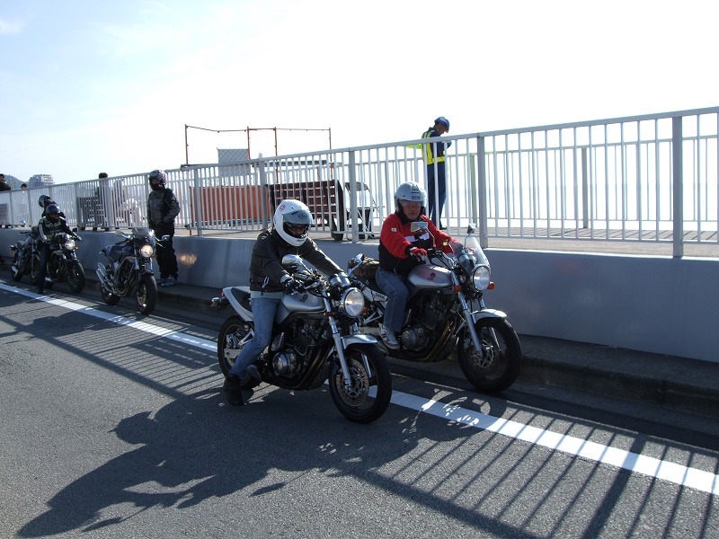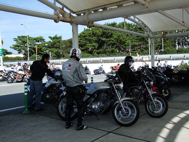 お茶のペットボトルを手にカメラ目線は、横浜に単身赴任中のSassy氏。 ツーリングのときはわざわざ浜松までバイクを取りに行き、終わったらまた浜松に戻ってバイクを置いて、 新幹線で横浜に戻るらしい…。