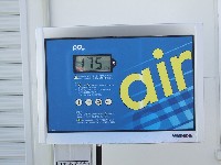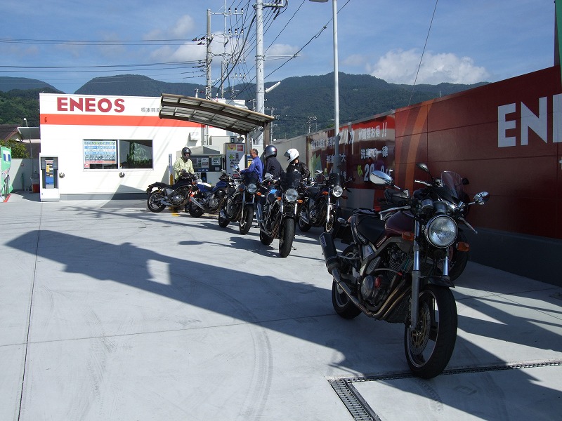 お山に入る前に、マシンの腹ごしらえをします。 中ー馬ッ鹿氏はスタンドのコンプレッサーでエアチェック。空気圧がデジタル表示されるんだぜ。スゲェ。 バルブチャックがクルマ用で、バイクのホイールには使いづらいのがアレだけれど。