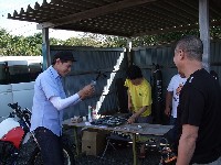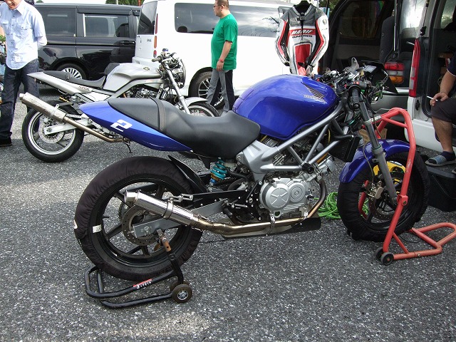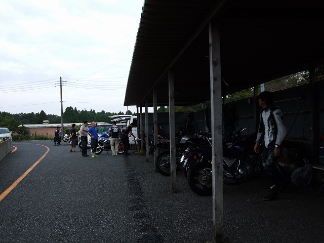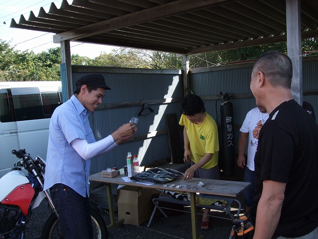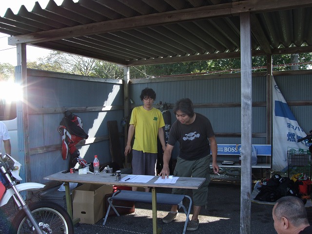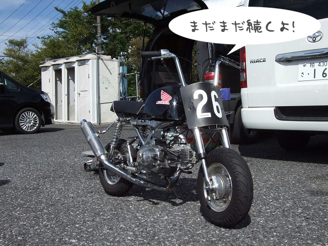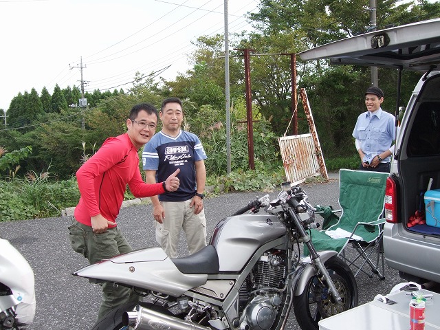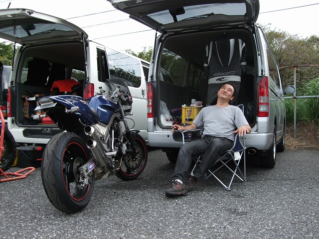 天候を心配してSRやミニバイクは結構な数のキャンセルがあった模様ですが、 リラックスムードのtakaちゃん、たー坊氏、タブチくん。 てゆーか、みんなトランポやん。雨関係ないやん!? Σ(・ω・ノ)ノ! |