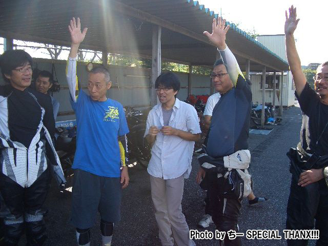 NARI氏&こきち氏の迷コンビによる朝のブリーフィング。 解散時に雨が降っていたら困るので、恒例のじゃんけん大会も朝イチで行います。 |