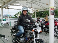 ジョン氏。黒のジェットヘルとペアスロープのワイン色の革ジャンが目印。