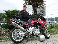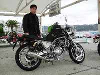 スナポン氏。二本出しマフラーにパニアケース、フュエルタンクのカーボンライン。