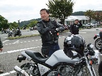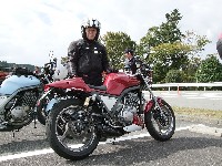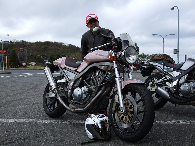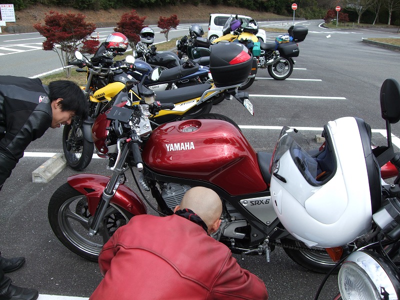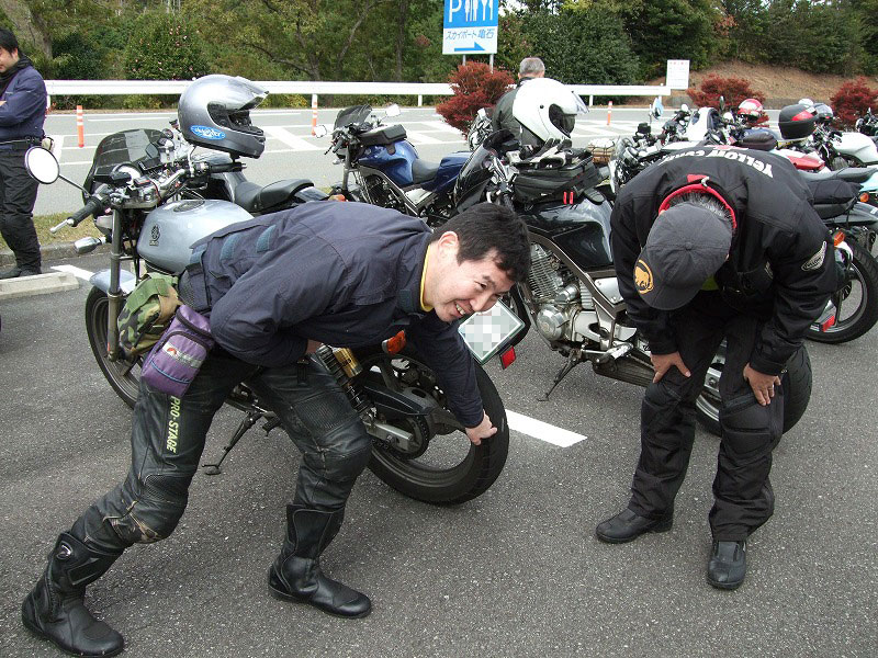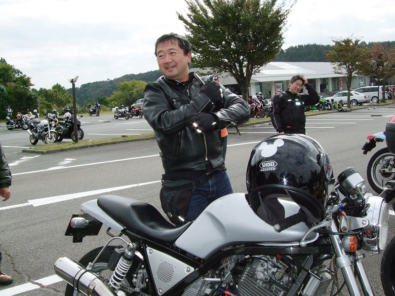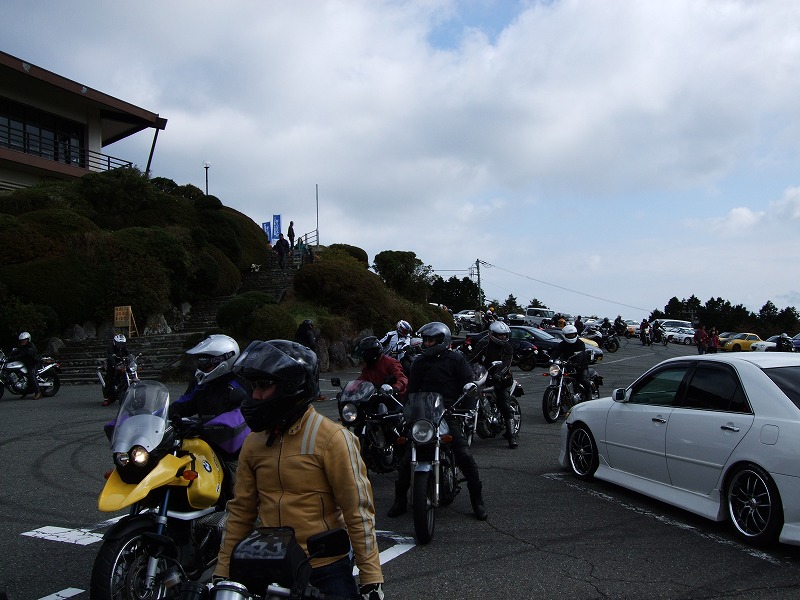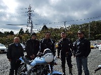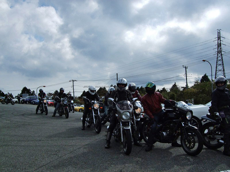 今年はエンジン焼きつきからシーズンが始まった中ー馬ッ鹿氏w いつもマイペース、しかし、メットの下の表情は大まjのヒロタ氏w 大観山のパーキングで仲睦まじく寛ぐman3一行。左から、 |