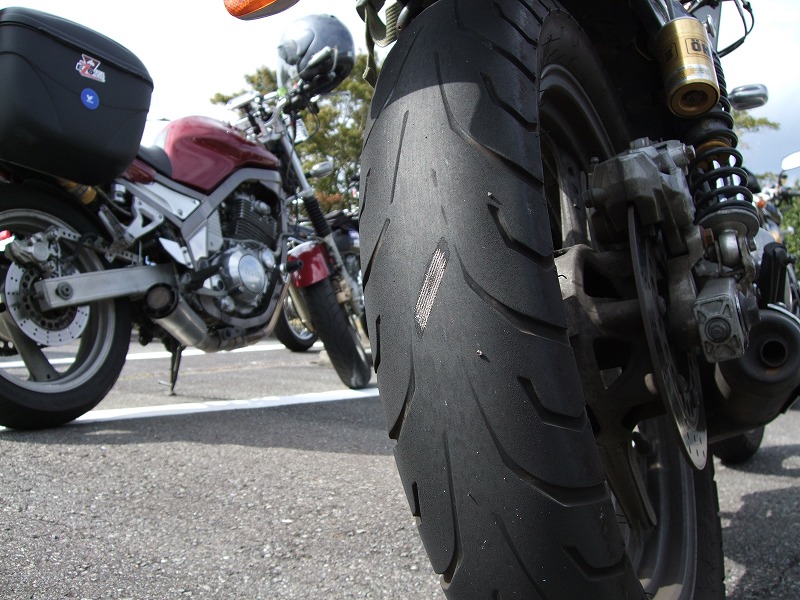 寅楠号のカコイーリアビュー。 コンパウンドが擦り減って下からカーカスが出てますよ。 寅楠氏:「何でここだけ出てるのかわからない。(・ε・)ブー」 |