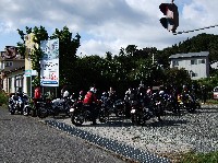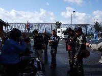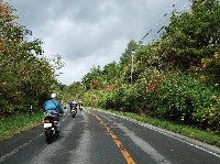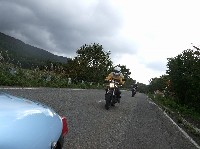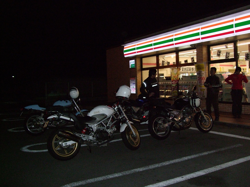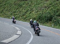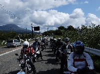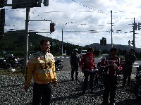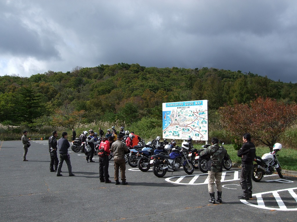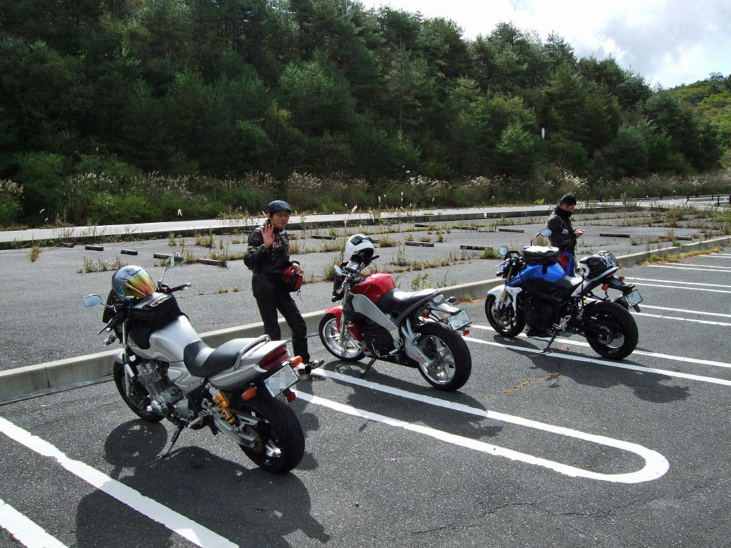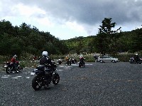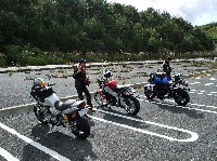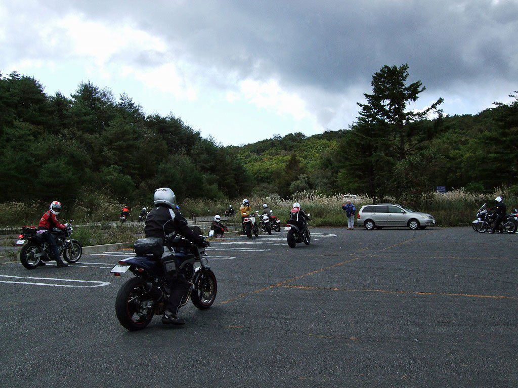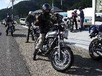 上空には青空が広がっているとゆうのに、ときおり雨がパラつき、路面はハーフウェット。 SRXの変態編隊とは、少し、距離を置いてバイクを停める元SRX乗りとSRX持ちたちw |
