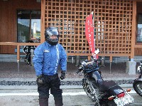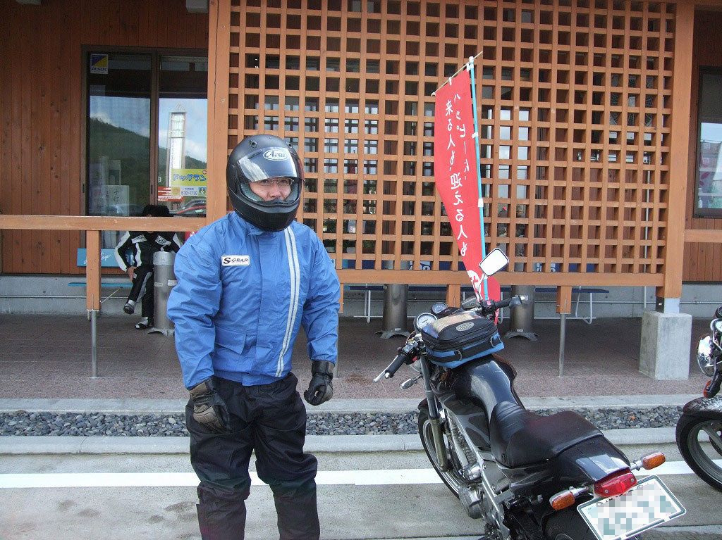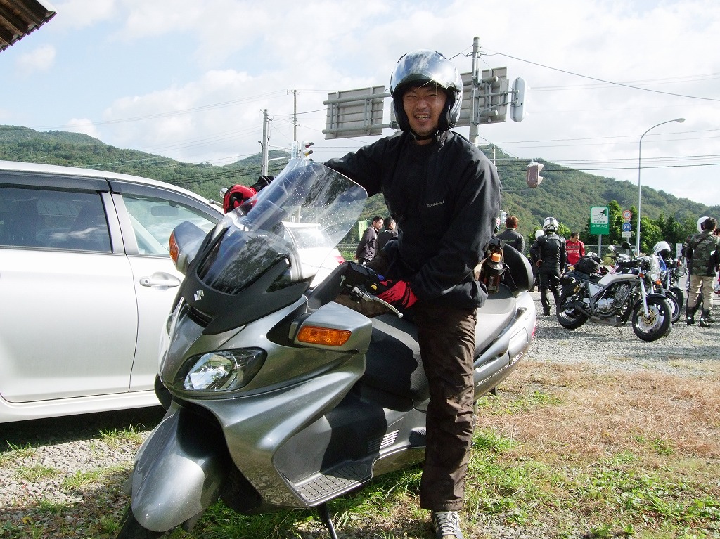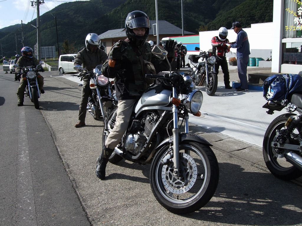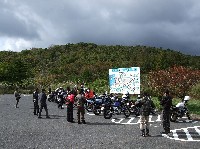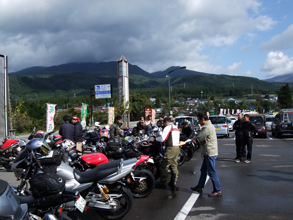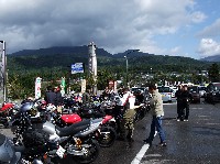 8:45 ryohrz氏の先導で、集合場所の『そば処森』に到着。 この春、SRXを手放してしまったまーさんは、借りもののSUZUKI SKYWAVE650で登場。 YELLOW CORNのジャケットが、今回、幹事を務めてくださる右曲がりのダンディー氏。 |