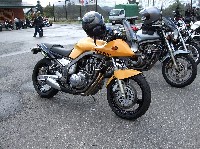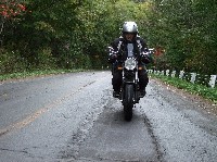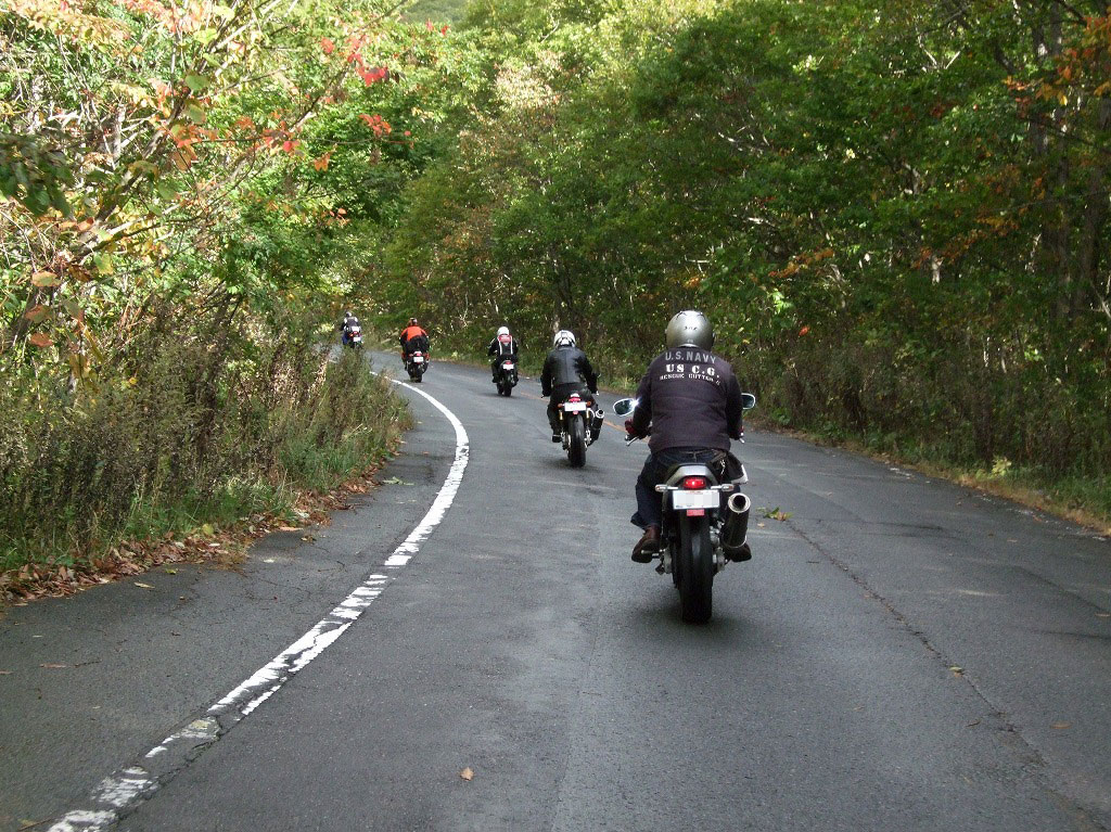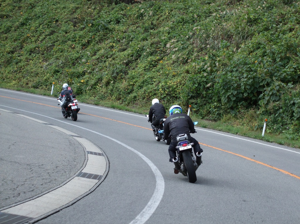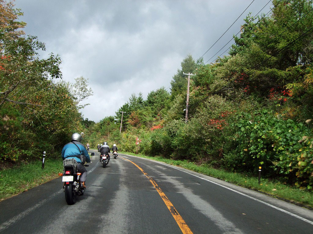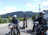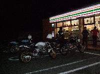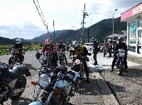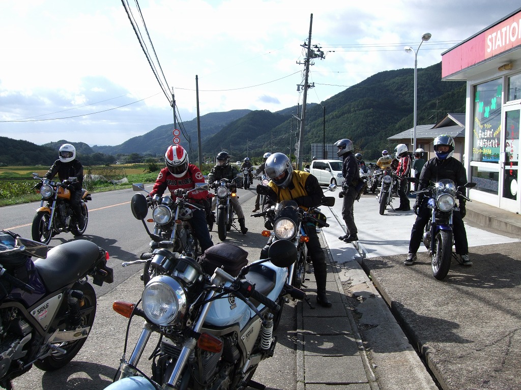 8:45 ryohrz氏の先導で、集合場所の『そば処森』に到着。 この春、SRXを手放してしまったまーさんは、借りもののSUZUKI SKYWAVE650で登場。 YELLOW CORNのジャケットが、今回、幹事を務めてくださる右曲がりのダンディー氏。 |