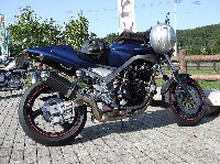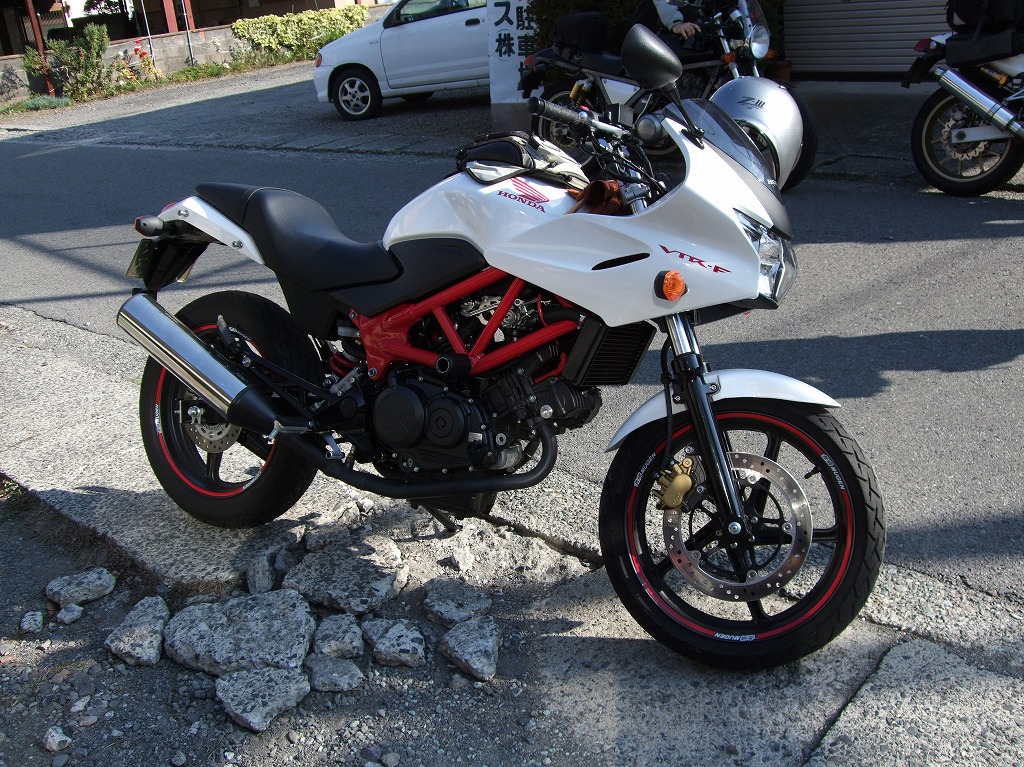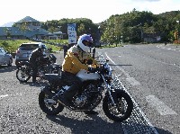 小次郎氏のVTR250F。ご好意で軽く試乗させていただきました。 速い!軽い!!扱いやすい!!!!! フルカスタムのSRX600からこのマシンに乗り換えられた小次郎氏。 めちゃくちゃカコイイワンオフマフラーが装着されたnabe氏のマシン。 この後、一行は馬頭、大子と南下して、里美のcocoストアで右曲がりのダンディー氏とお別れしました。 |