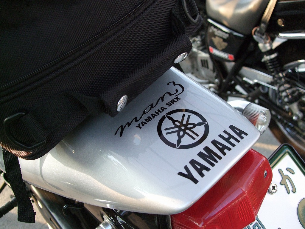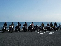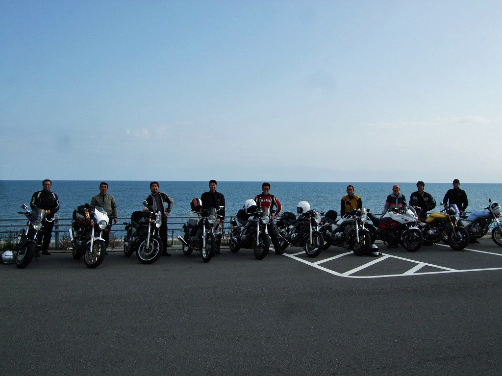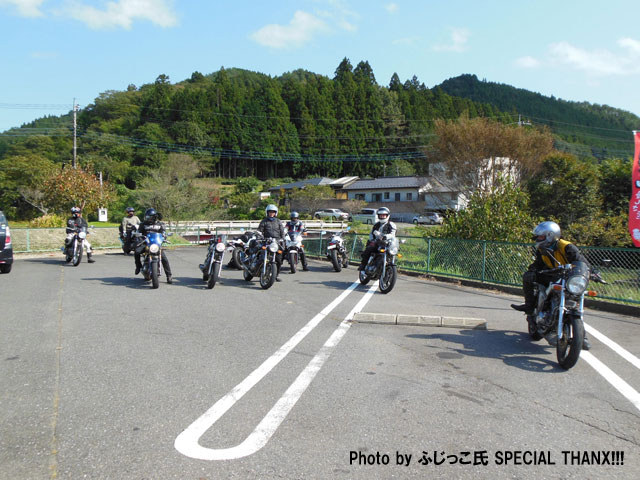 日立バイパス沿いのパーキングで、二日目の面子と集合写真。 ふじっこ氏のテールカウルに自作の“man3”ステッカーが貼られているのを発見。 |