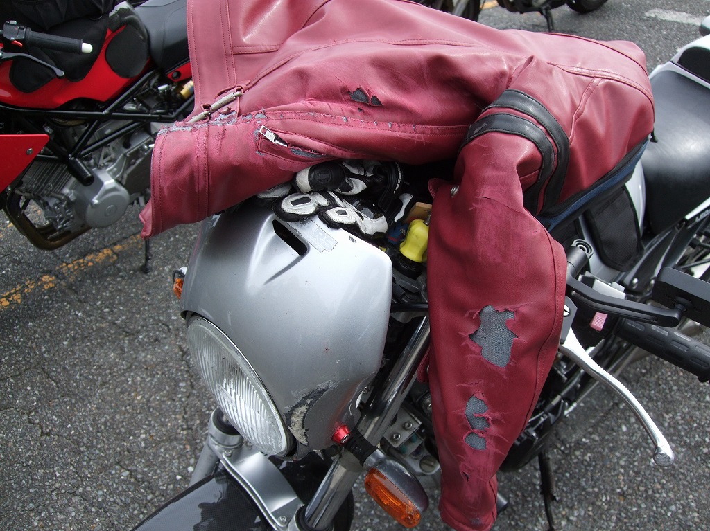 ホイールが削れ、ステップがひん曲がり、リアブレーキはフルードが漏れて効かない状態…。 「見つかっちゃった(てへぺろ)。知らんぷりしていれば気づかれないと思ったんだけれど…。」 いや誰とは言わないけれど、誰かがチクったんだYo?w |