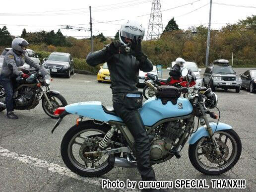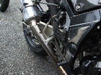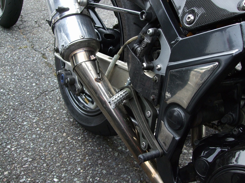 ふつうのひとは、転んだ時点ですごすご帰っちゃいますよね。 ホンダ純正を加工したというサイレンサーが「おっ!?」と思わせる青のIV型。 |
