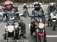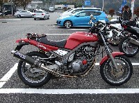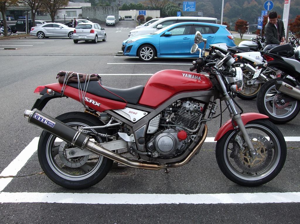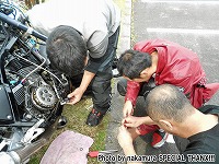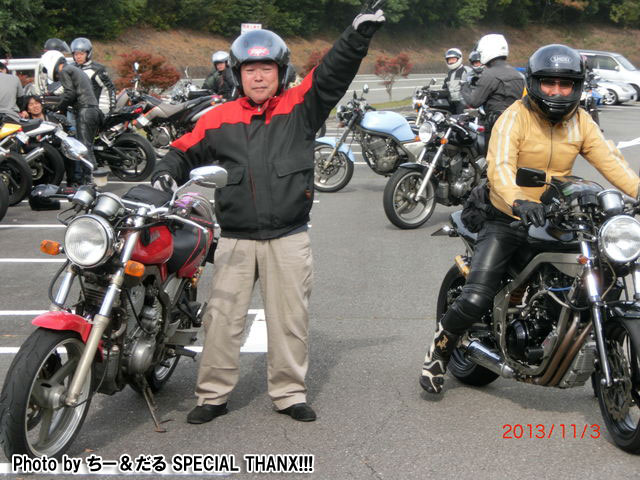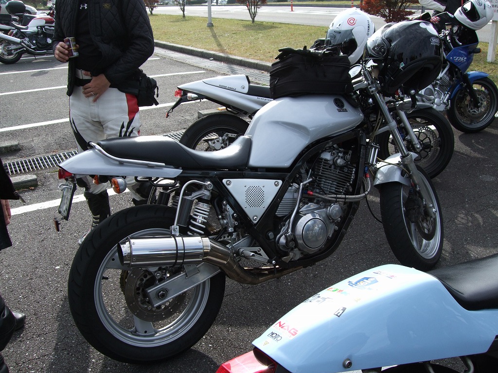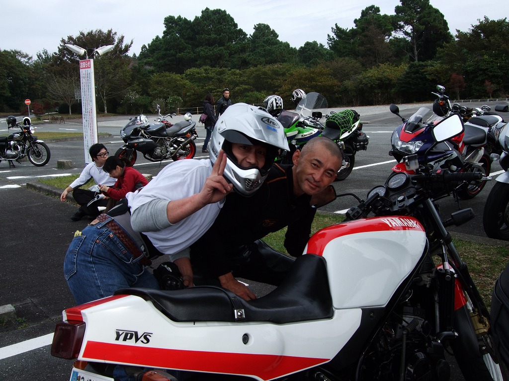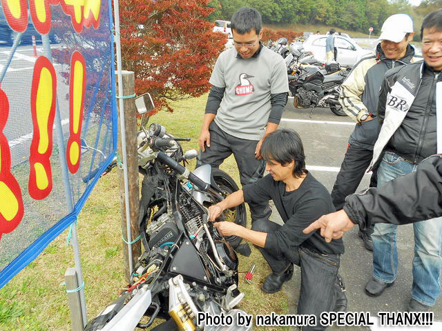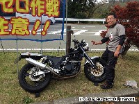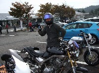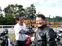鍛冶屋氏のマシンはSOHCエンジニアリングの鍛造ピストンが組み込まれた実験車両。 ぴぃ氏は、ジョン氏のRZ-Rを試乗。ええ音させて愉しんでおりました。 開襟シャツと指だしグローブがトレードマークのしま氏。 |