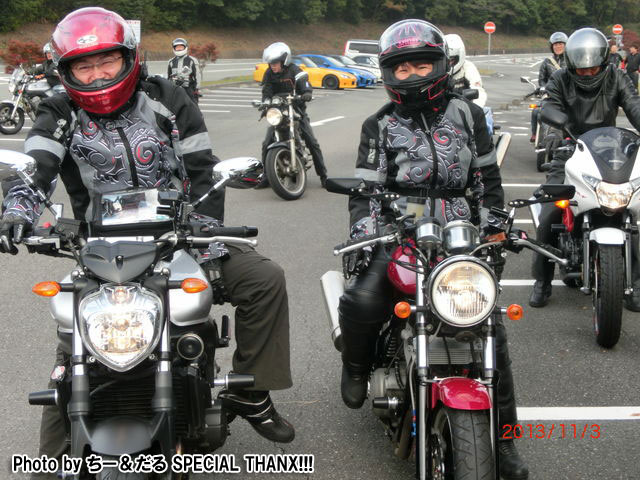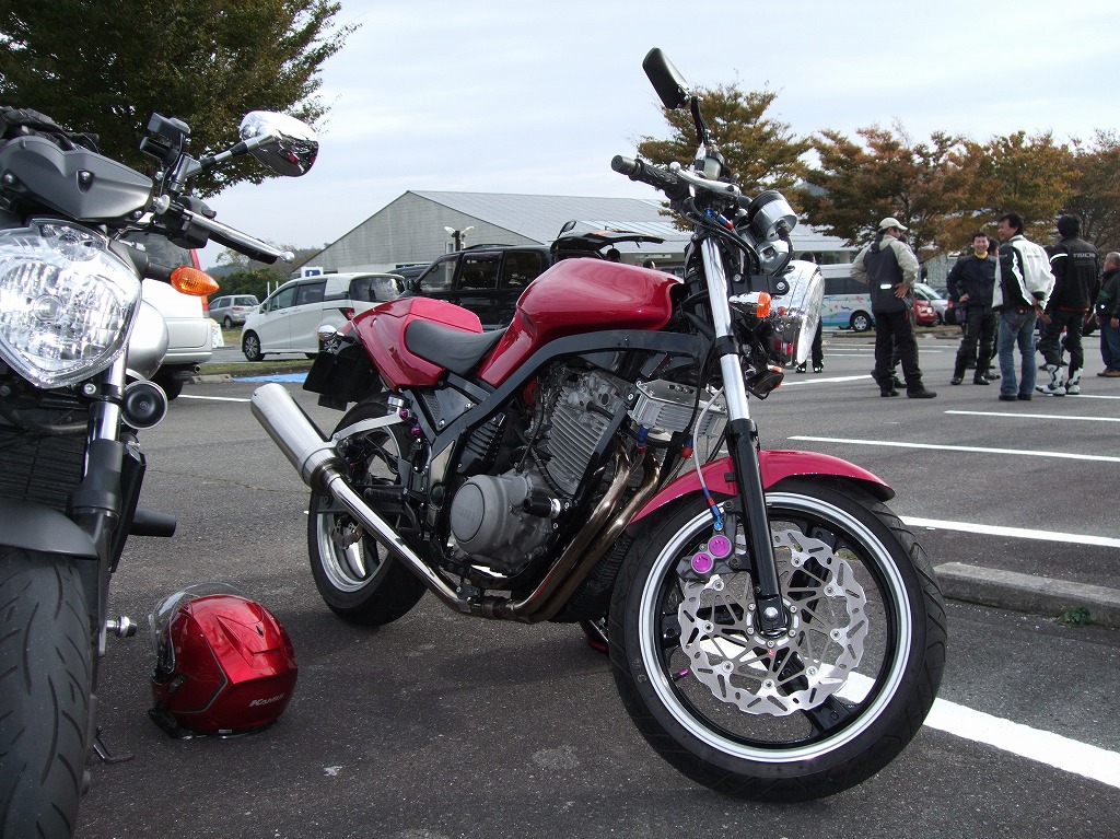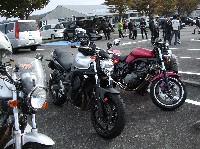 しじみ@女子力号の隣は、旦那のこうヤン氏の…、FZ6かな?8かな?? みっきー号のアルミ製ワンオフグラブバーに、初期型乗り全員が『イイね!』をつけましたw 何ンかツボに入れちゃったtakaちゃんとツボに入れられちゃったみっきー氏w |