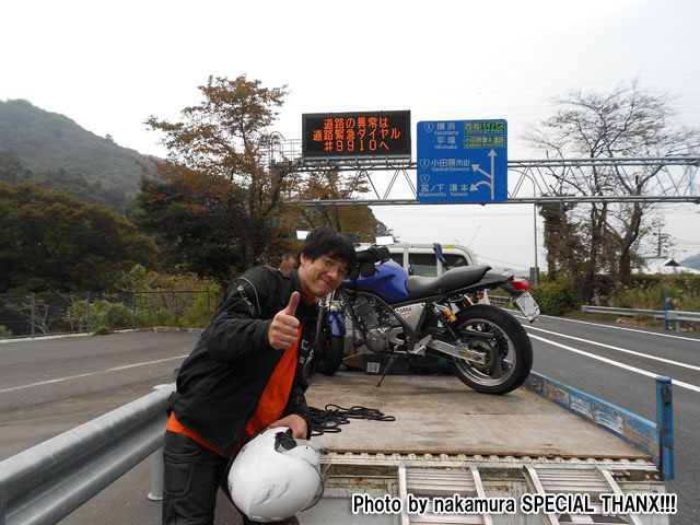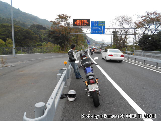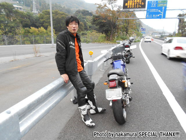 さて、冒頭でも触れたとおり、僕は私用で一足早く帰ったんですが、 箱根新道の出口でガードレールにもたれて哀愁を振りまくnakamura氏。 |