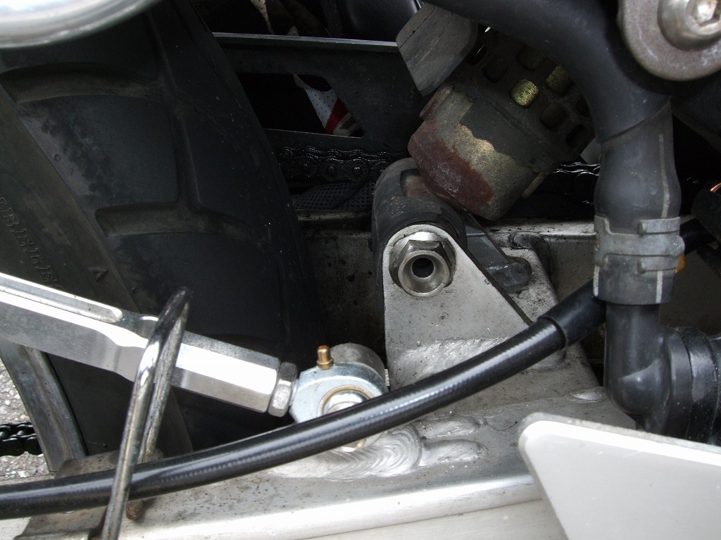 隕石号はオリジナルのマニホールドでシングルキャブ化されています。 このマシンを入手したときからこうなっていたそうな。 モノサスを受け止める中空ボルトはホンダVTR250からの純正流用ということですが、 何処に使われているボルトなのかは不明w でも、いちばんの自慢は道の駅スタンプラリー制覇のステッカーなんだってw