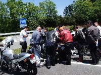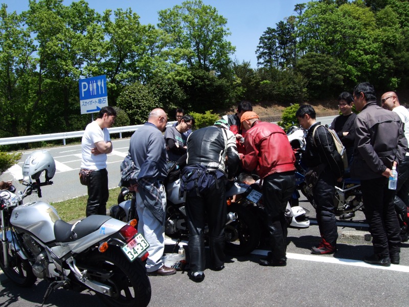亀石PAに着くと、何やら不穏な雰囲気が…。またもやあっち号ですw アルミ製のサイレンサーステーが根元からぽっきり逝ってますよw ここぞとばかりに暇なオサーンたちが大集合して、 あーでもないこーでもないと対策を練り始めますw